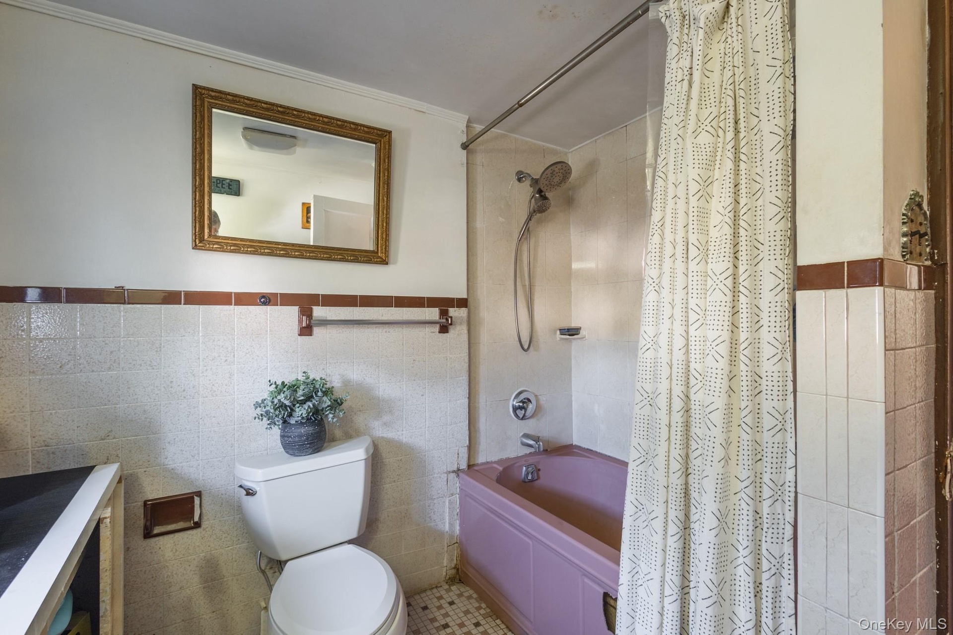 - Full bathroom featuring tile walls, shower / bathtub combination with curtain, a wainscoted wall, vanity, and ornamental molding