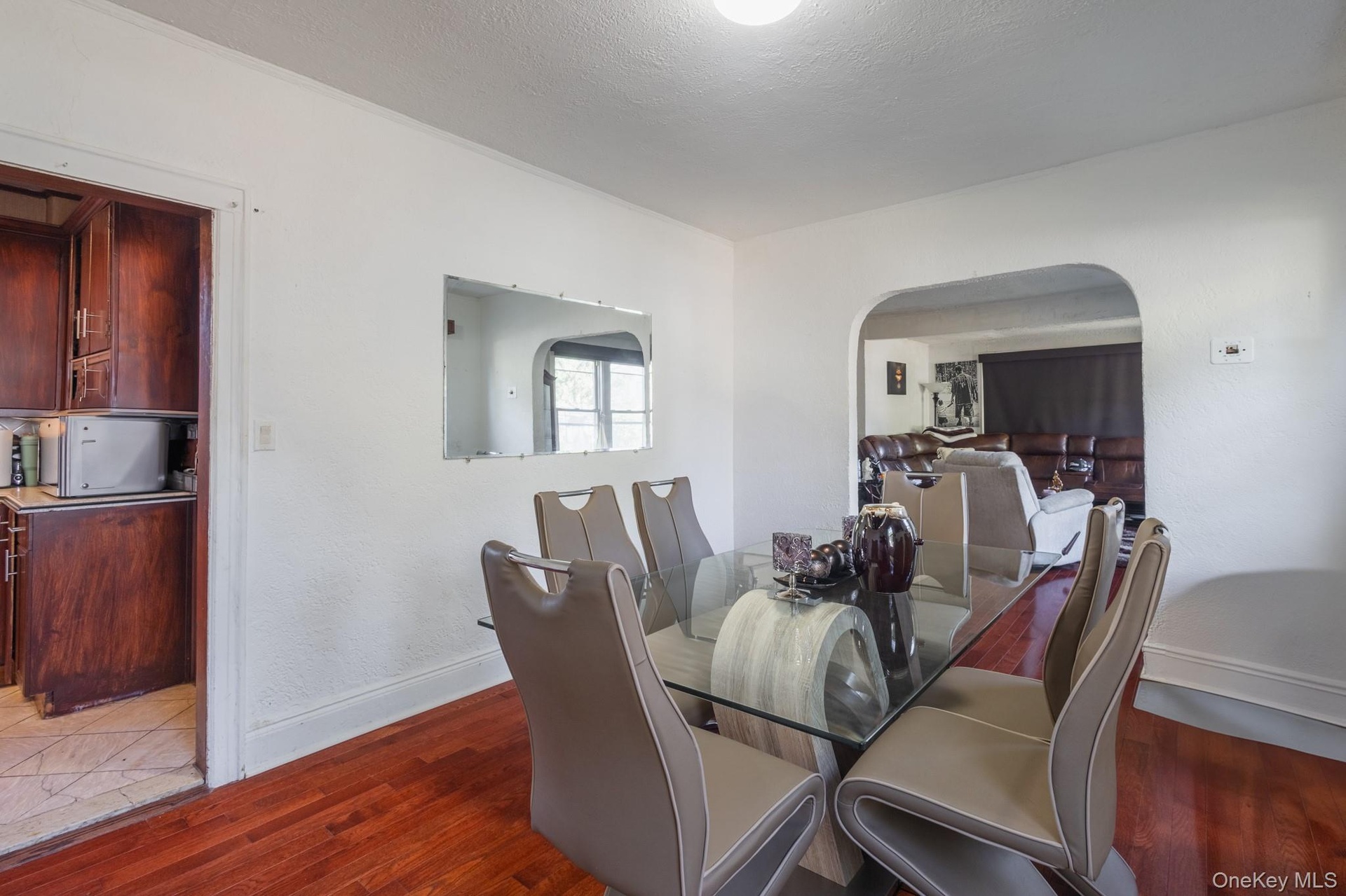 - Dining area featuring wood finished floors, a textured wall, a textured ceiling, and arched walkways