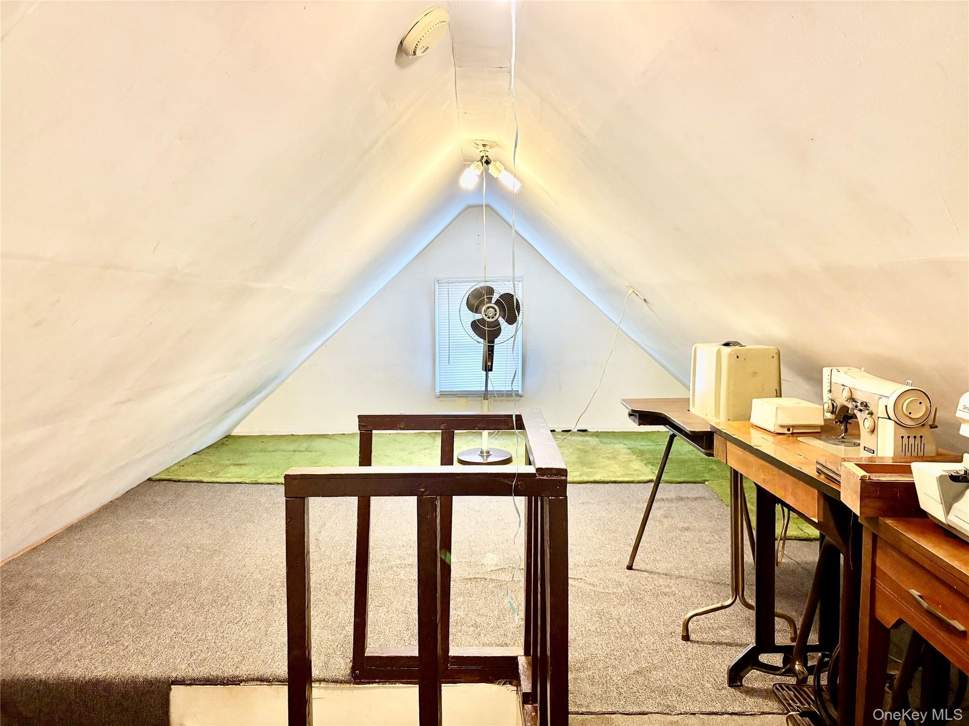 - Additional living space featuring vaulted ceiling and light carpet