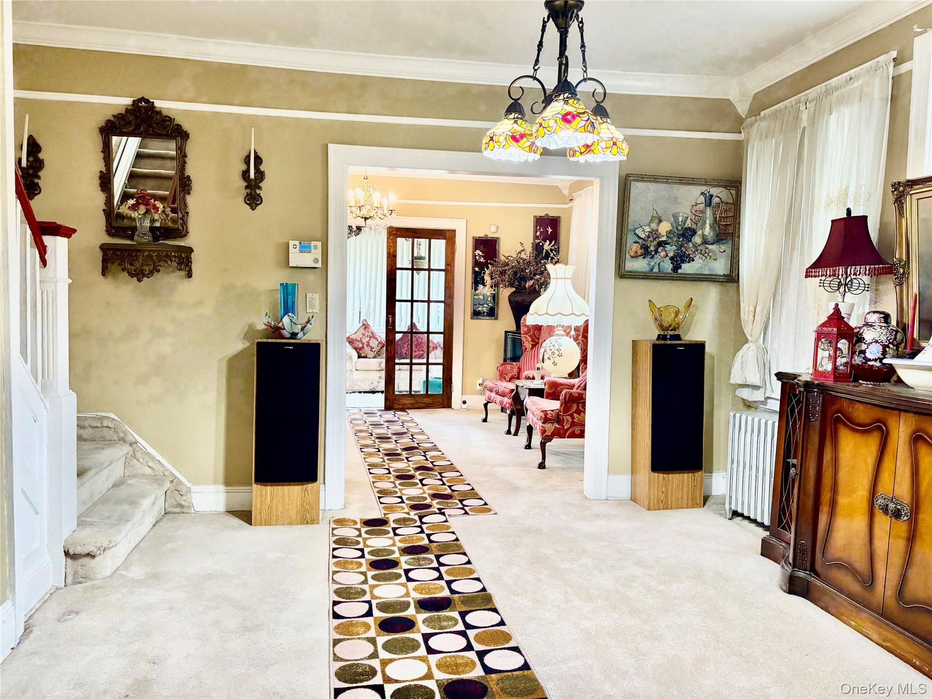 - Living area with crown molding, light carpet, plenty of natural light, and a chandelier