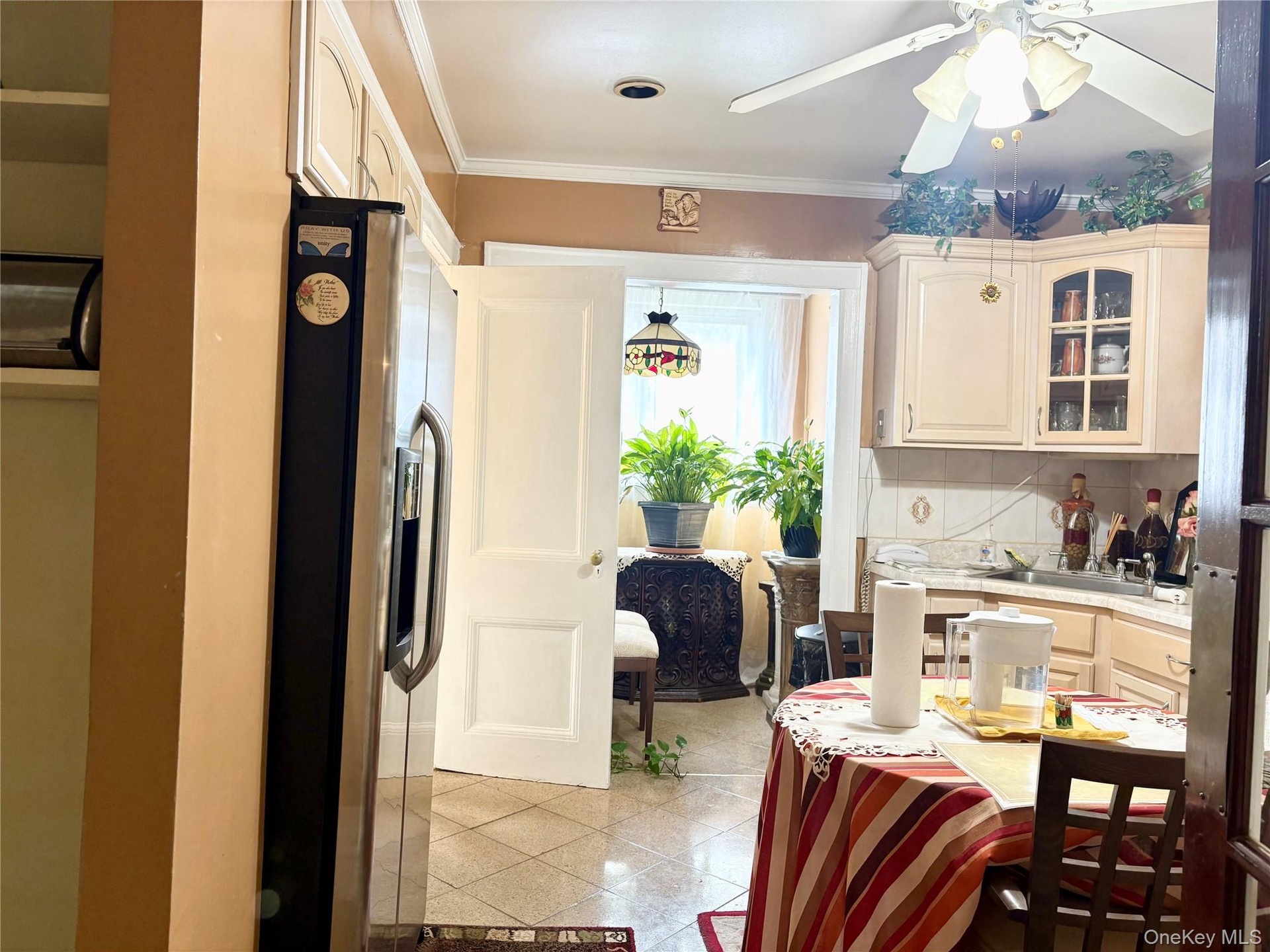 - Kitchen with crown molding, stainless steel fridge with ice dispenser, light tile patterned floors, a ceiling fan, and glass insert cabinets
