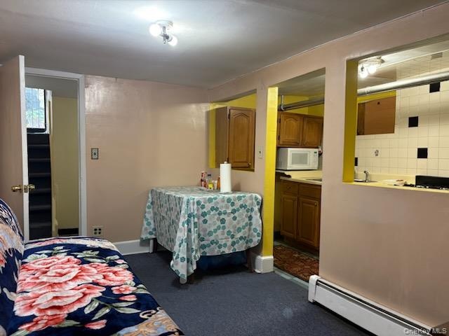 - Bedroom featuring a baseboard radiator and dark colored carpet