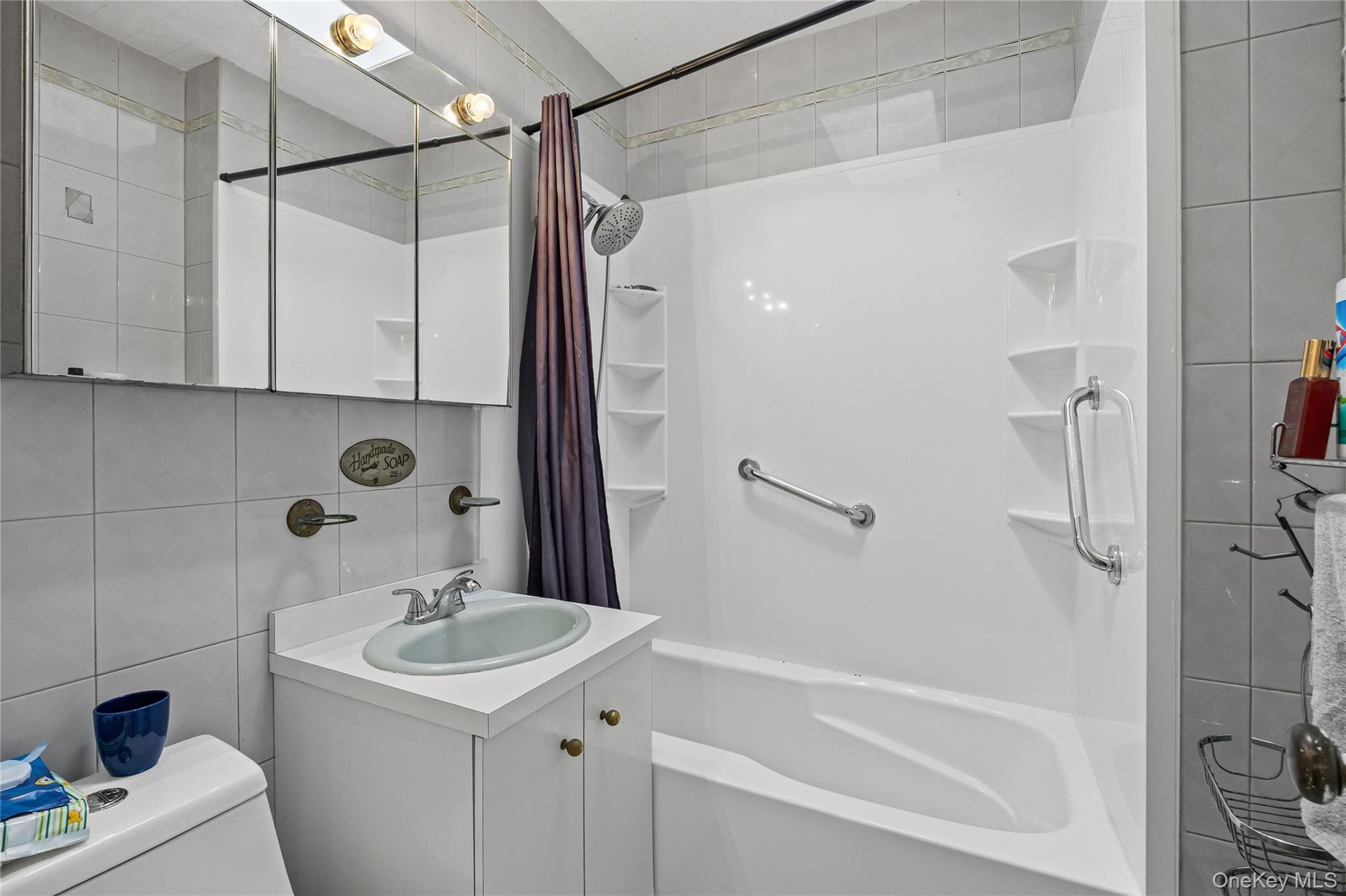 - Bathroom with tile walls, vanity, and shower / bath combination with curtain