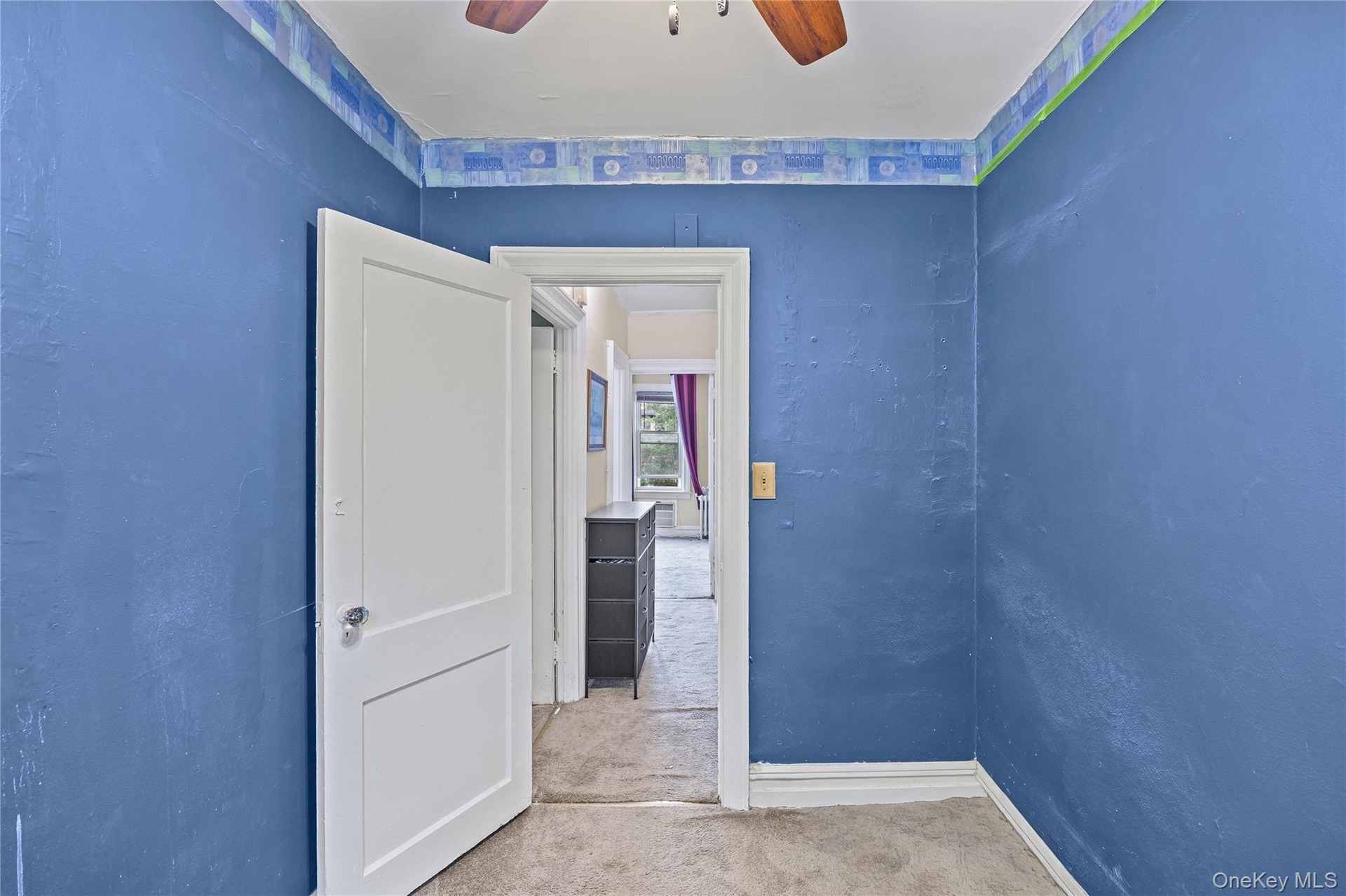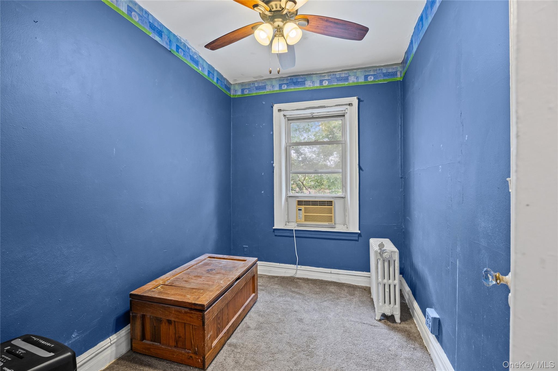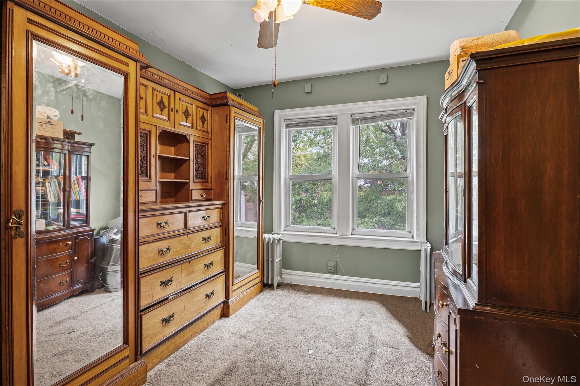 - Bedroom with light colored carpet, ceiling fan, and radiator heating unit