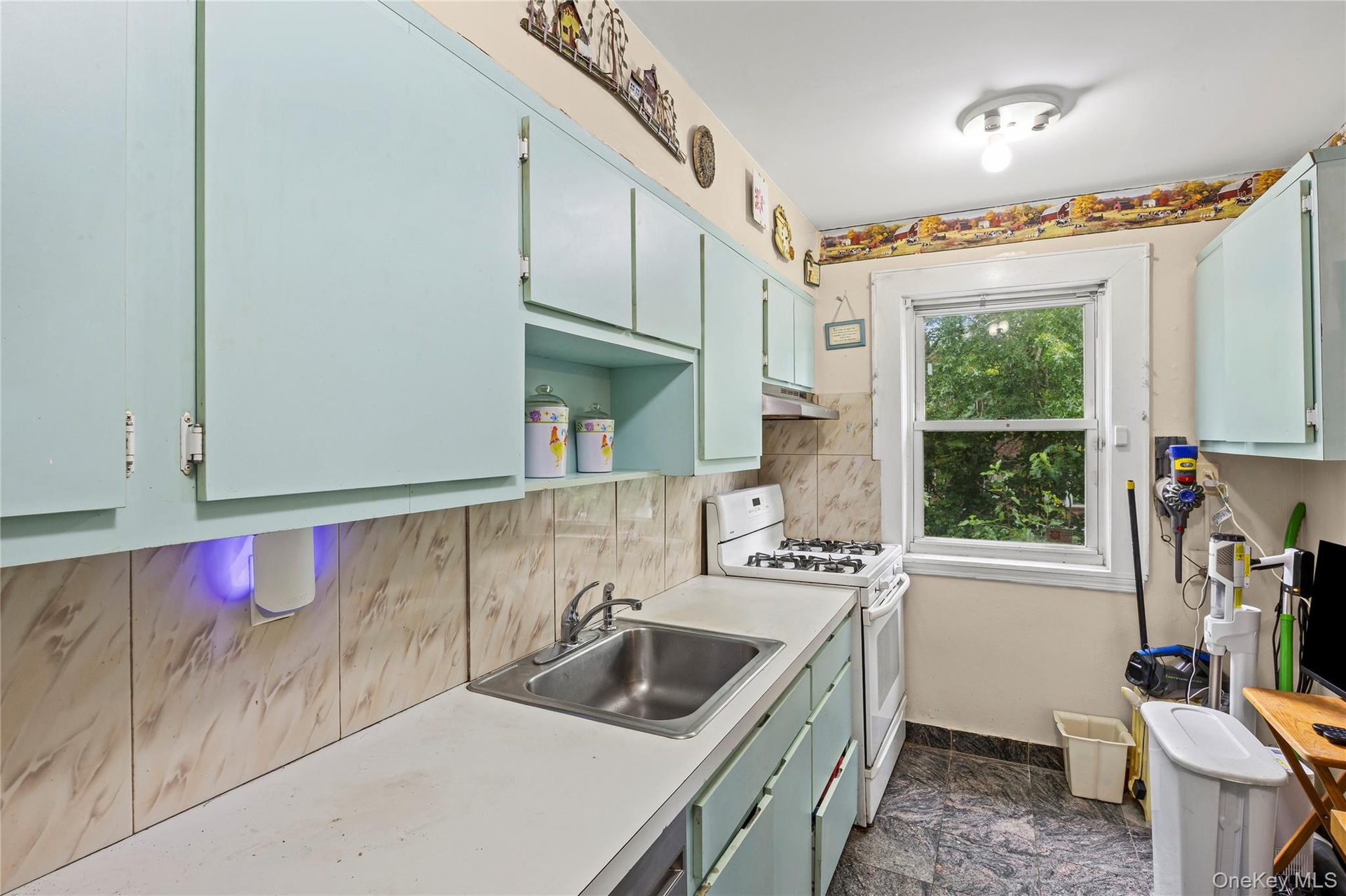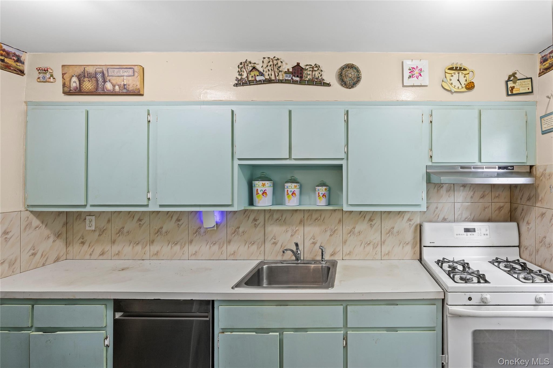 - Kitchen with white gas stove, light countertops, and green cabinetry