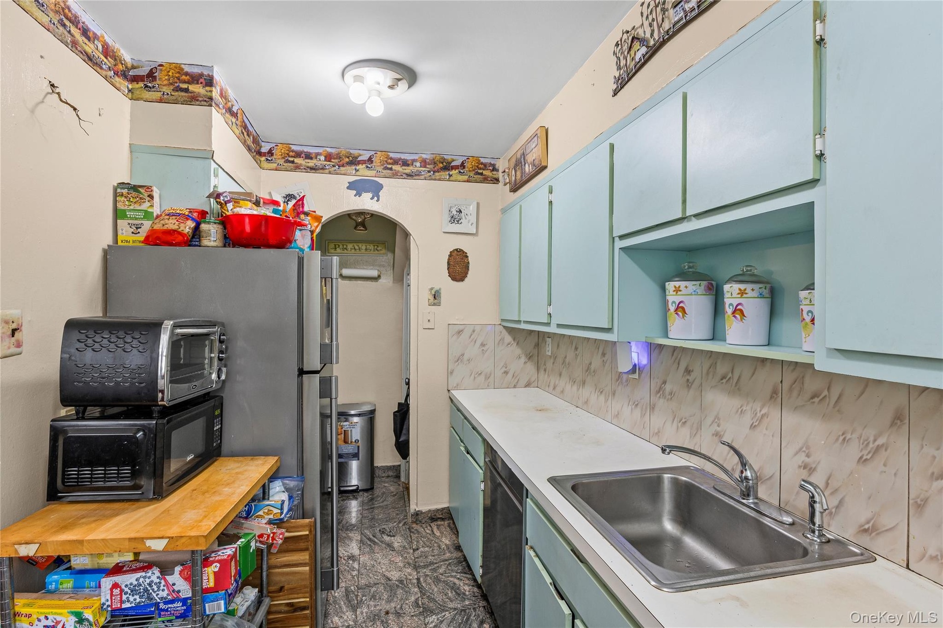 - Kitchen featuring light countertops, open shelves, arched walkways, decorative backsplash, and stainless steel dishwasher