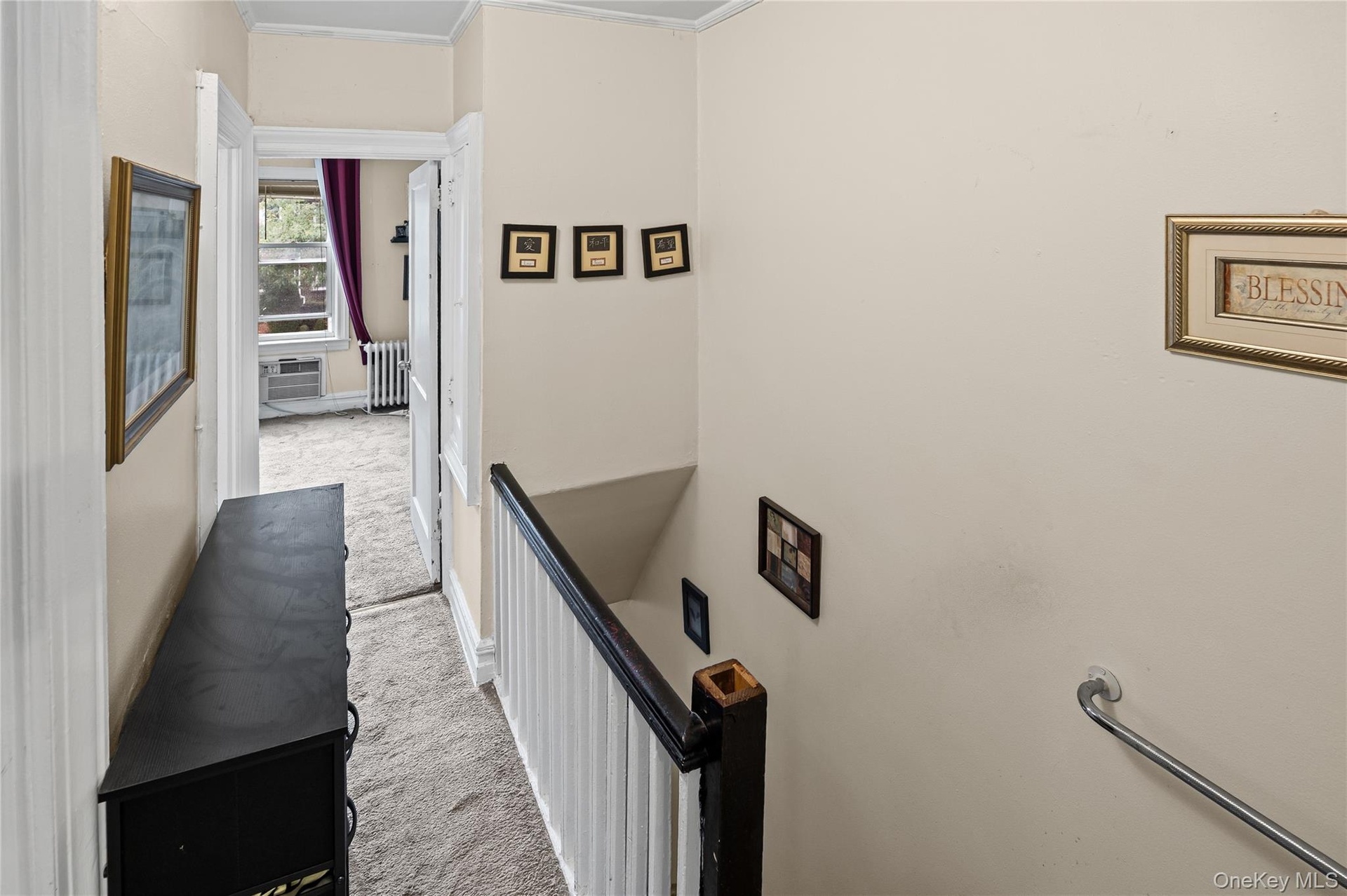 - Hallway with light colored carpet, an upstairs landing, radiator heating unit, and crown molding