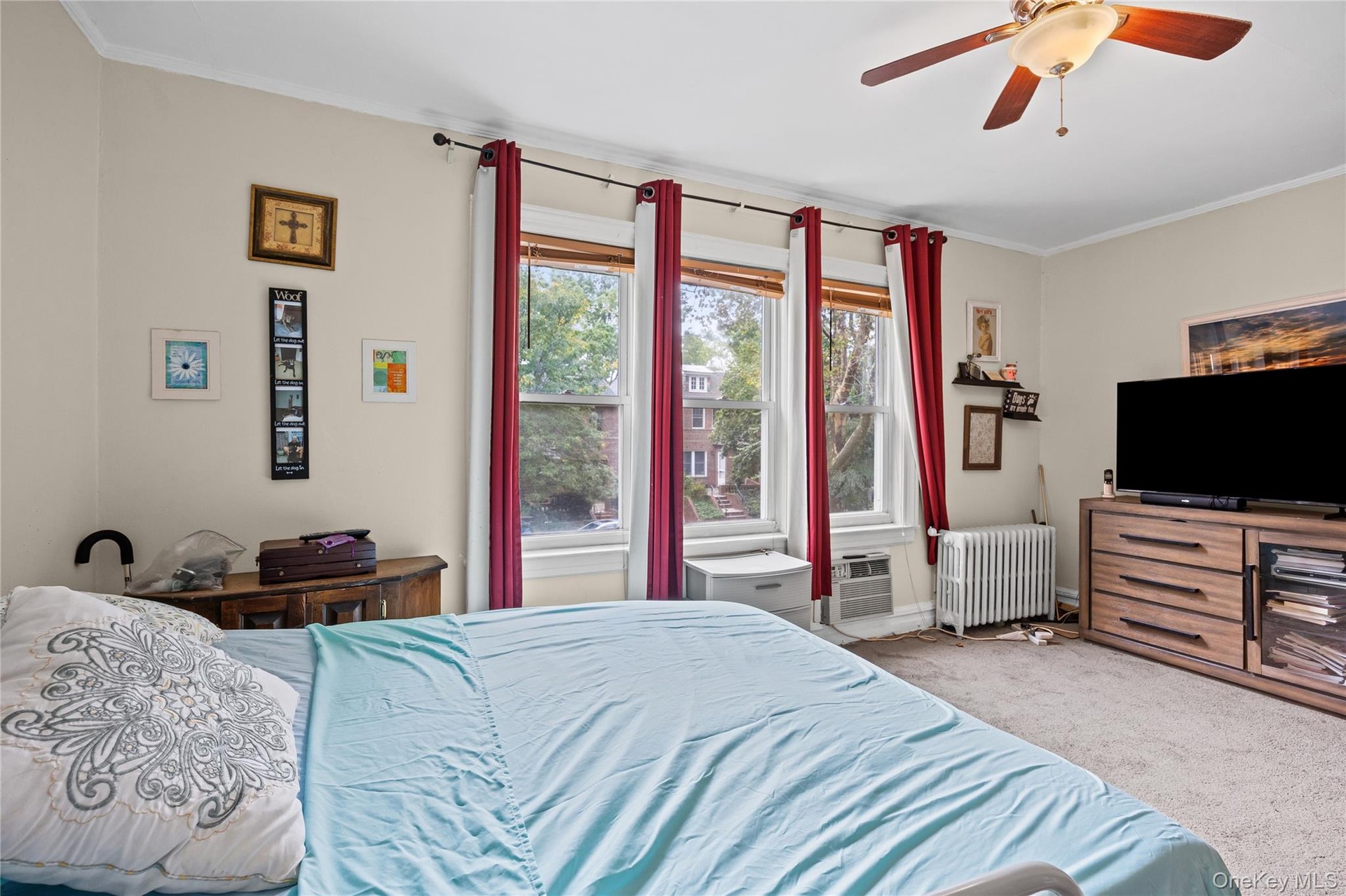 - Bedroom featuring ornamental molding, radiator heating unit, a ceiling fan, carpet flooring, and an AC wall unit