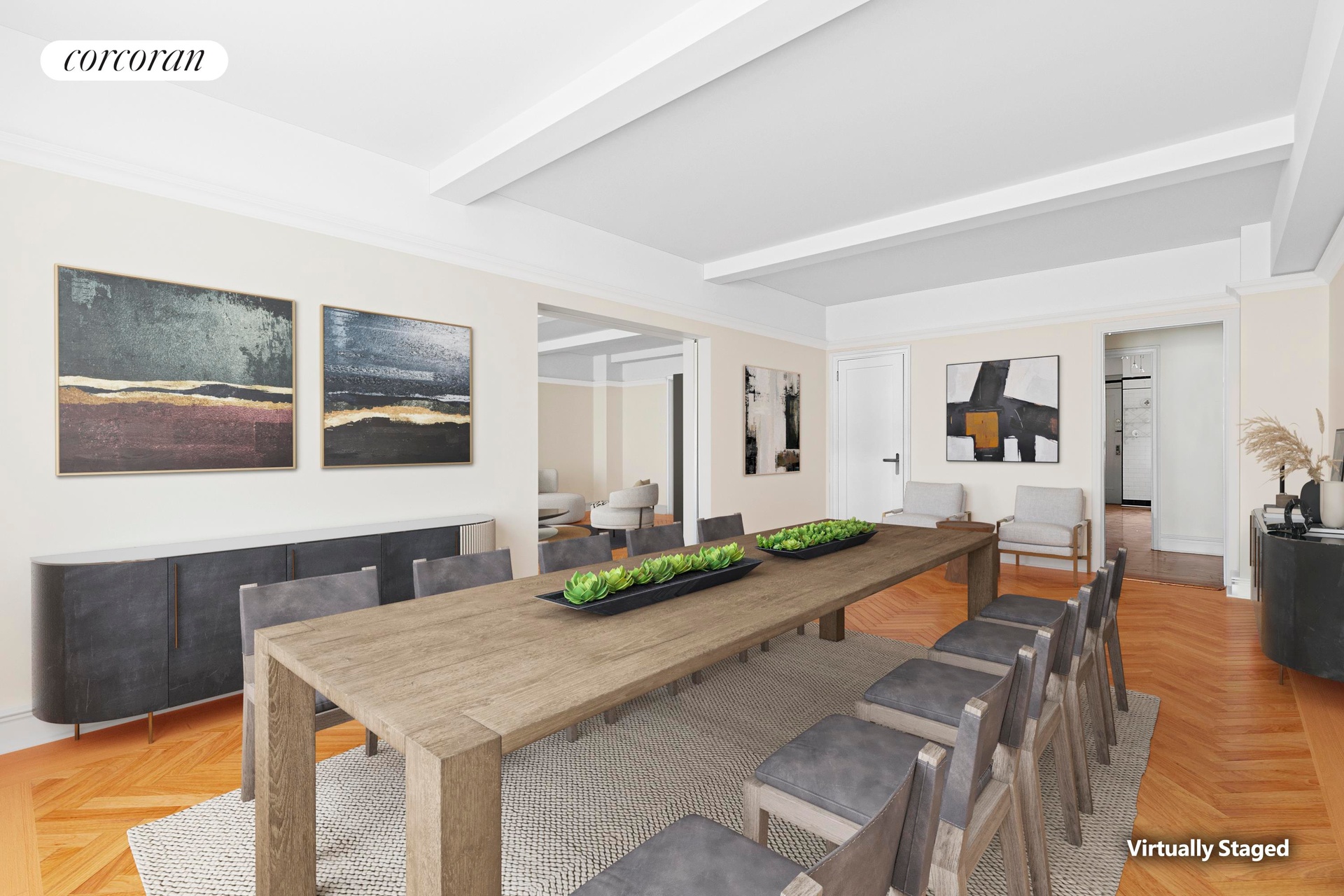 Perched on a high floor, the elevator opens to a semi-private landing shared by one neighbor. This expansive, sun-drenched Classic Seven residence features three spacious bedrooms, 2.5 renovated bathrooms, and a versatile staff room or additional bedroom. Exquisite pre-war architectural details, such as high-beamed ceilings and beautifully patterned solid wood flooring, elevate the home's timeless elegance. The gracious formal dining room and adjoining living room create an inviting setting for intimate gatherings and grand entertaining. Thoughtfully designed for modern comfort, this home includes through-the-wall air conditioning. Bathed in natural sunlight, the residence boasts 13 oversized picture windows, with all three bedrooms offering Hudson River views. The primary bedroom is situated in the southwestern corner, featuring ample closet space and a windowed en-suite bathroom with double sinks and a walk-in shower.