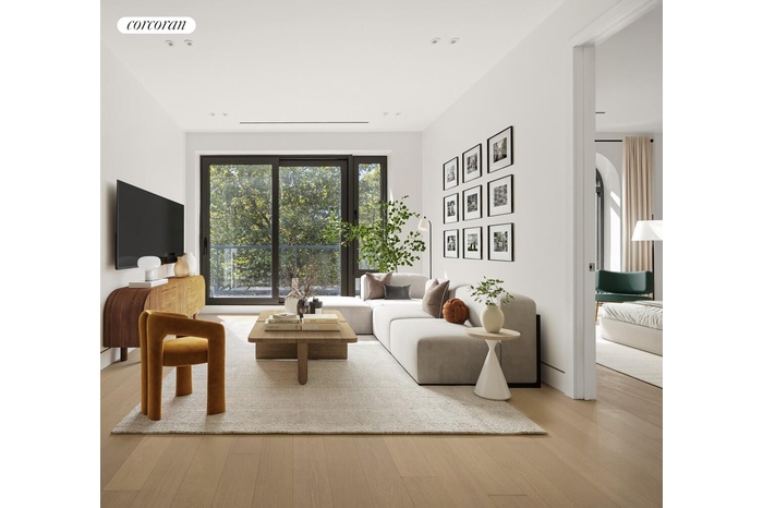 The living room is oriented for intuitive furniture placement and anchored by a wall of glass doors that open directly to the sunny front yard.