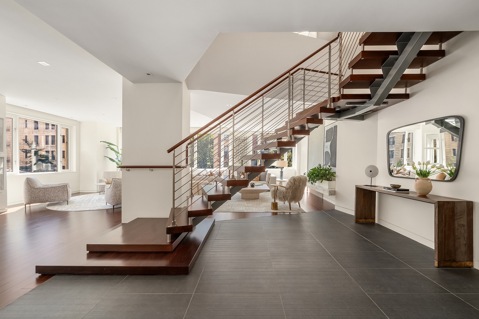 Entering from a private, keyed elevator, the custom-designed Maretti staircase sets the focal point for this stunning home. The expansive, corner great room boasts a full-length floating Planika fireplace and ample space for a living and dining arrangement.