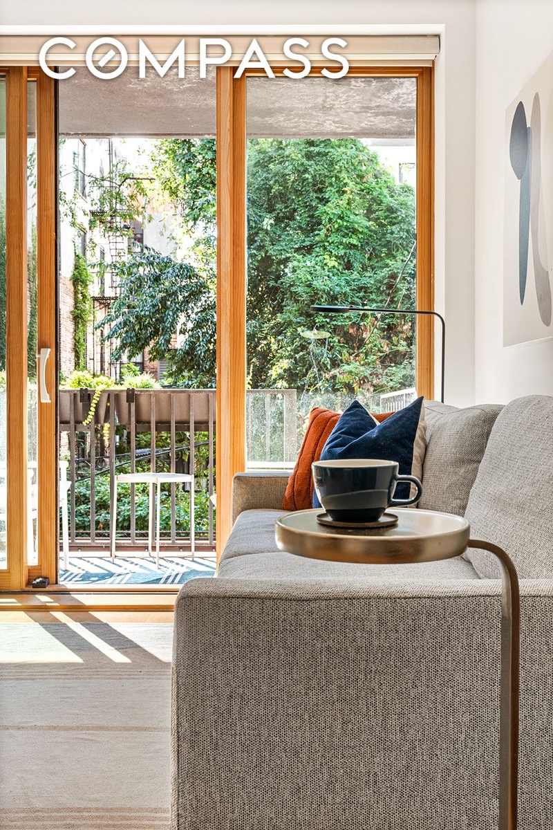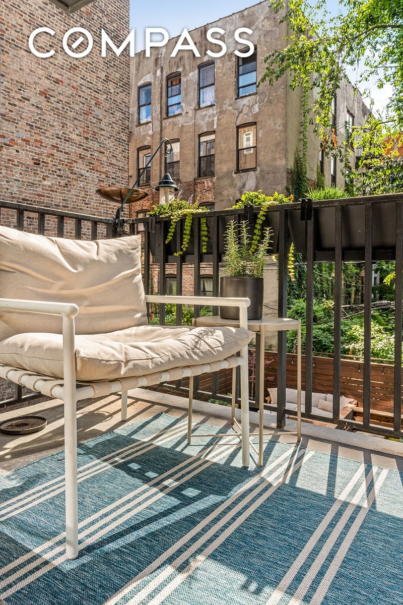 Welcome home to 714 Jefferson Avenue, 2B - a 521 sqft one-bedroom residence featuring an open-plan living space designed to accommodate dining, lounging, and entertaining with seamless access to a private balcony with direct stair access to the landscaped rear garden. The kitchen spans a full wall with sleek, handle-free cabinetry for maximum storage. A premium appliance suite includes a Bosch wall oven, dishwasher, vented range, and a Bertazzoni cooktop.