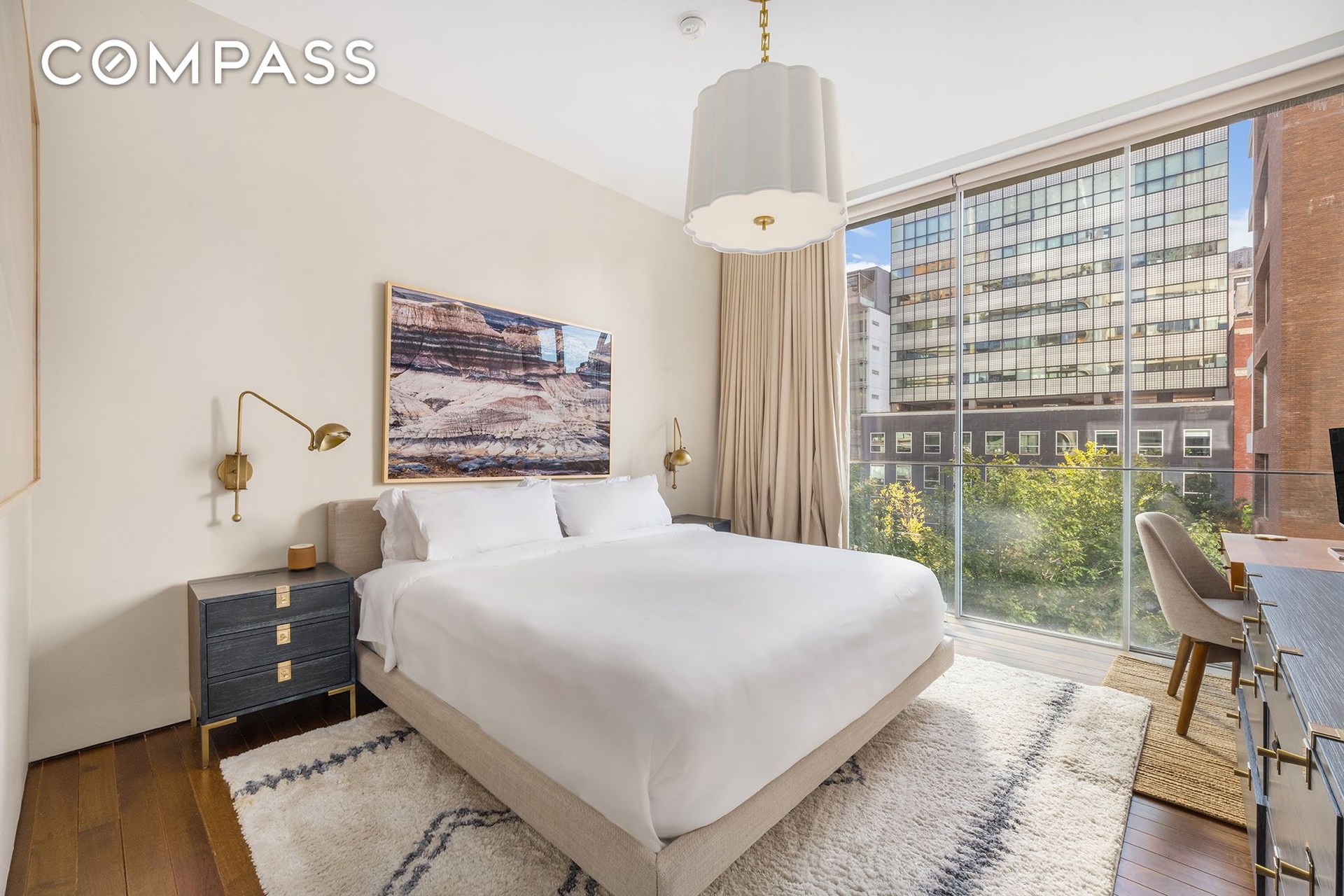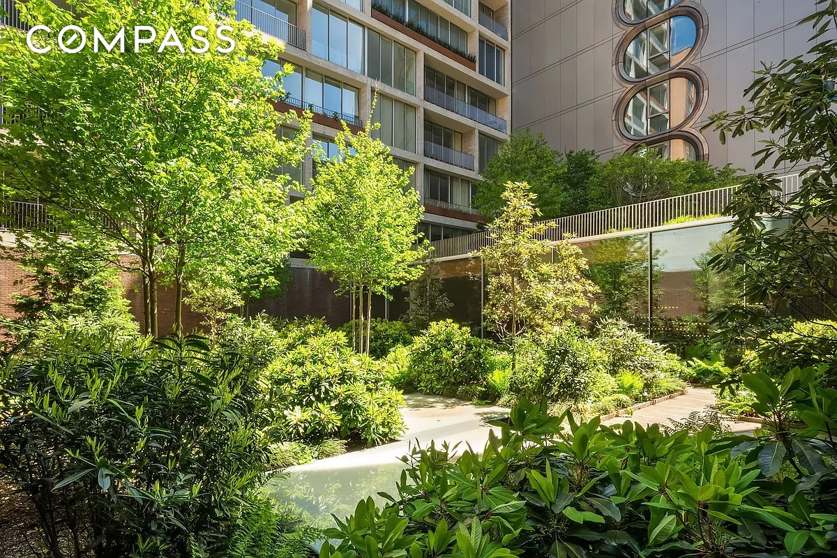 The apartment is filled with southern light and features floor-to-ceiling sliding windows that open onto Juliet balconies with views of landscaped gardens and the skyline. Interiors include 10-foot ceilings, 7-inch wide-plank oak floors, and a custom Molteni kitchen with stainless steel countertops and Gaggenau appliances. The oversized bathrooms are finished in graphite marble with radiant heated floors, and the home also includes a washer/dryer, central air, custom closets, and a separate powder room.