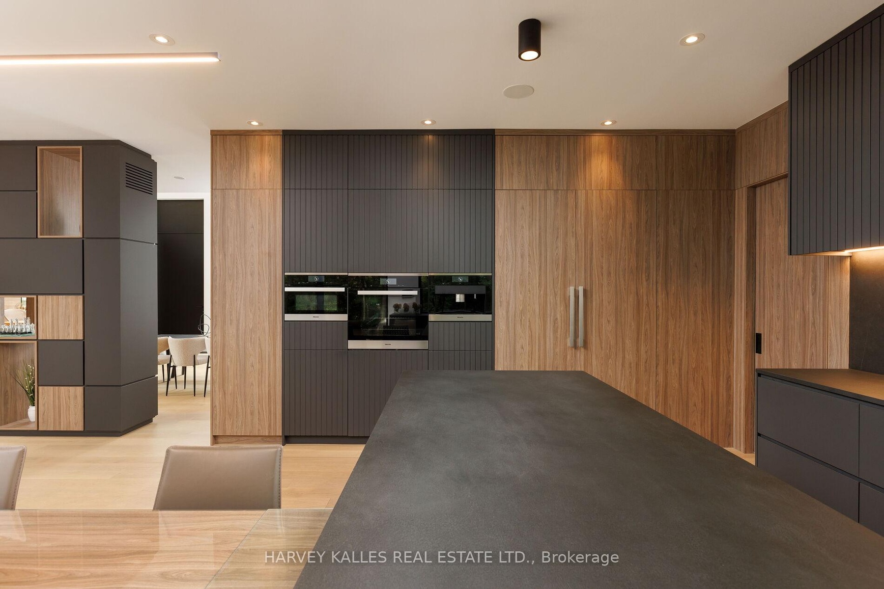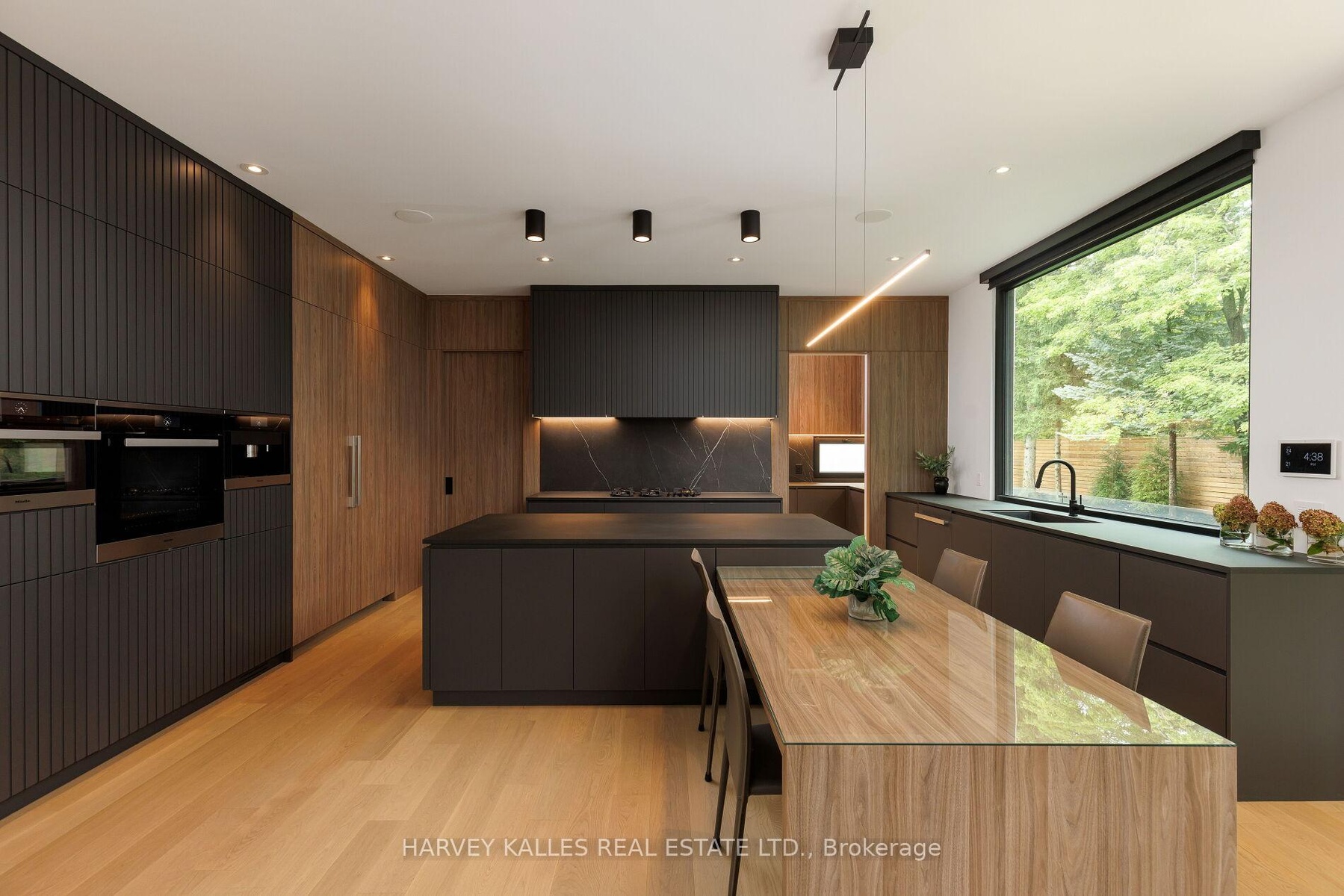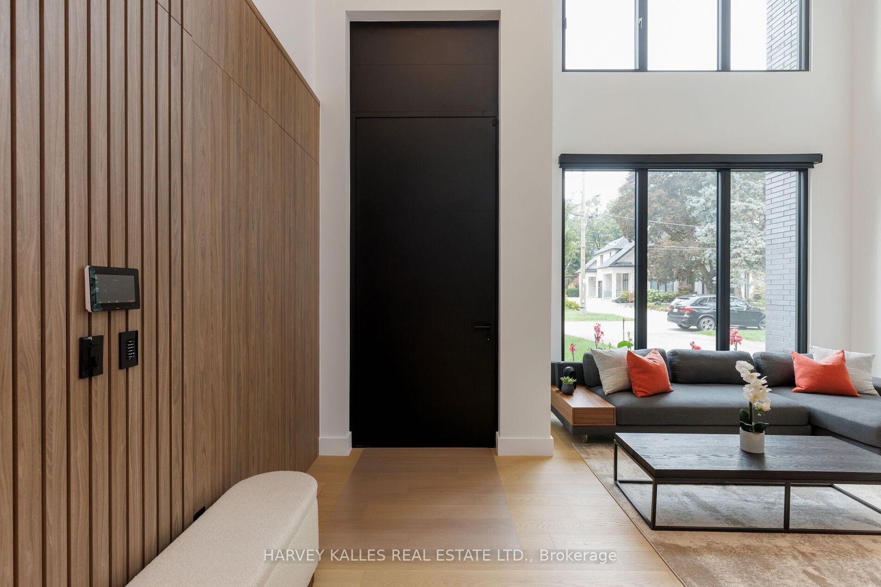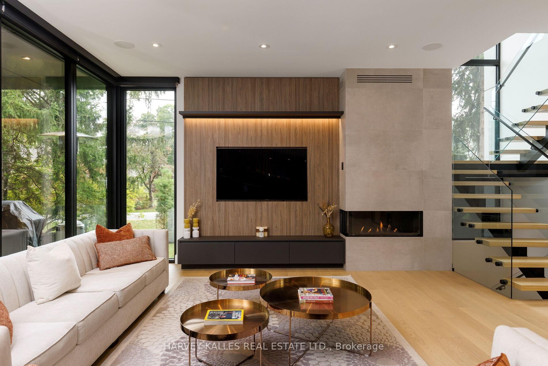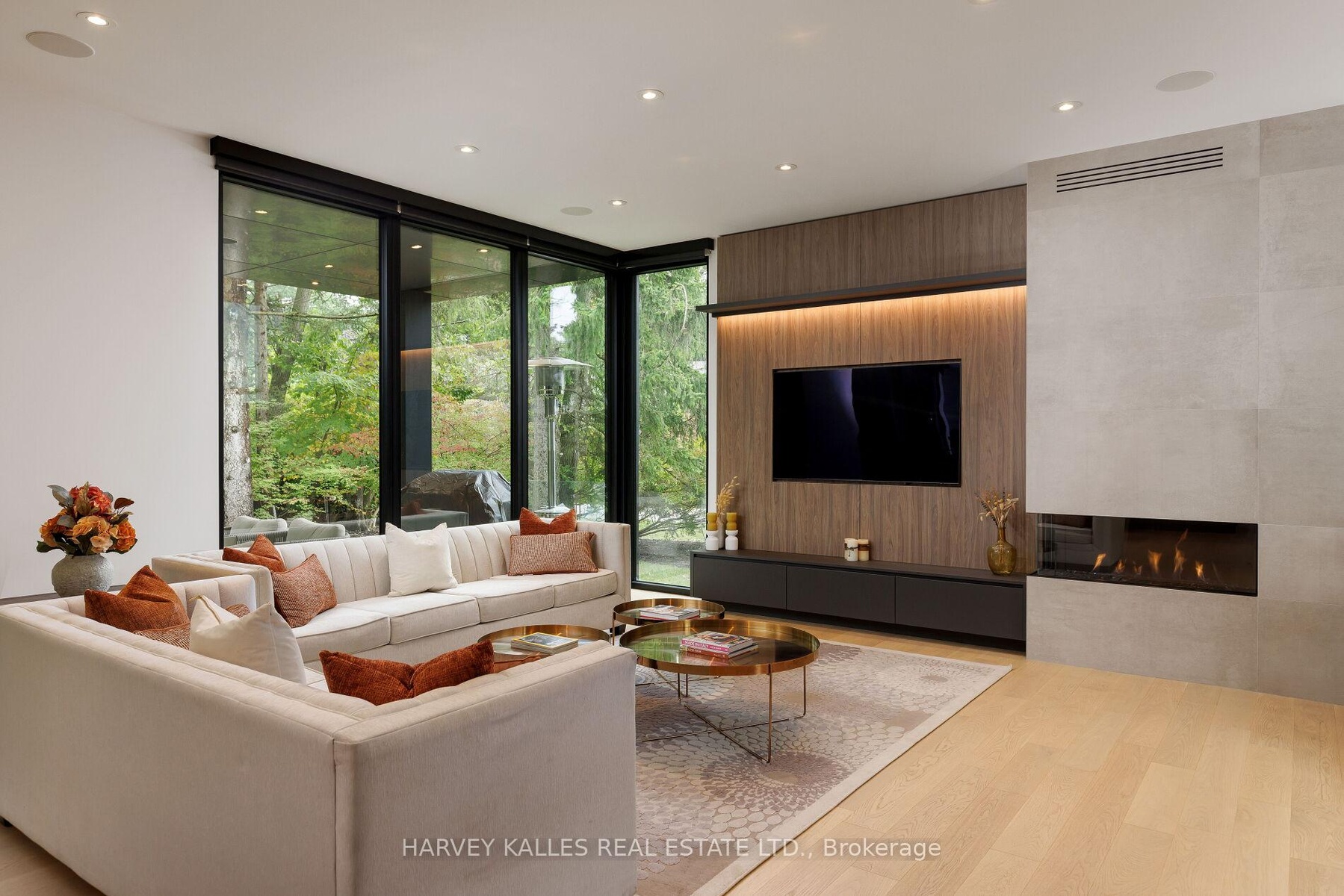 Exceptional custom residence with a masterful fusion of contemporary design with serene zen influences. 6600+ sq. ft. of finished living space, carefully crafted over four years. Dramatic 20-foot foyer with its illuminated glass pivot door, with expansive light-filled spaces highlighted by a floating staircase, architectural feature panel walls, and warm custom millwork. On the main level, a modern family room with a striking two-sided linear fireplace provides both comfort and sophistication, while the bespoke executive office offers custom millwork and gorgeous treetop views. The chefs kitchen is a true showpiece, featuring Miele appliances, a PITT gas counter range, and a separate catering kitchen. A stylish powder room, skylights, heated floors, and refined cabinetry complete the main level.The primary suite is your private retreat with a spa-inspired ensuite, custom walnut and glass walk-in closets, and a cozy lounge complete with 3-sided fireplace ambiance. Additional bedrooms feature en-suite baths and built-in cabinetry, with a flexible fourth bedroom suite that provides versatility. Your laundry room with full custom millwork completes the upper level. The lower level is an entertainment and wellness oasis ... 15-seat soundproof theatre, glass-walled temperature-controlled wine cantina, open-concept gym, and a sleek wet bar create the ultimate space for relaxation and hosting. A nanny or guest suite with a spa-like ensuite and direct walkout to the landscaped grounds ensures comfort and privacy for extended stays. The exterior showcases modern brick and aluminum cladding, beautifully landscaped grounds with irrigation, and sleek architectural lighting. Technology is seamlessly integrated with a Control4 smart home automation system, delivering comfort, convenience, and efficiency at your fingertips.This is more than a home it is a contemporary zen oasis, where design, technology, and tranquility converge to create a sanctuary for modern living.
