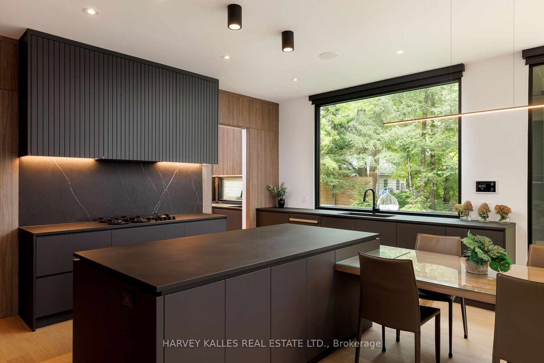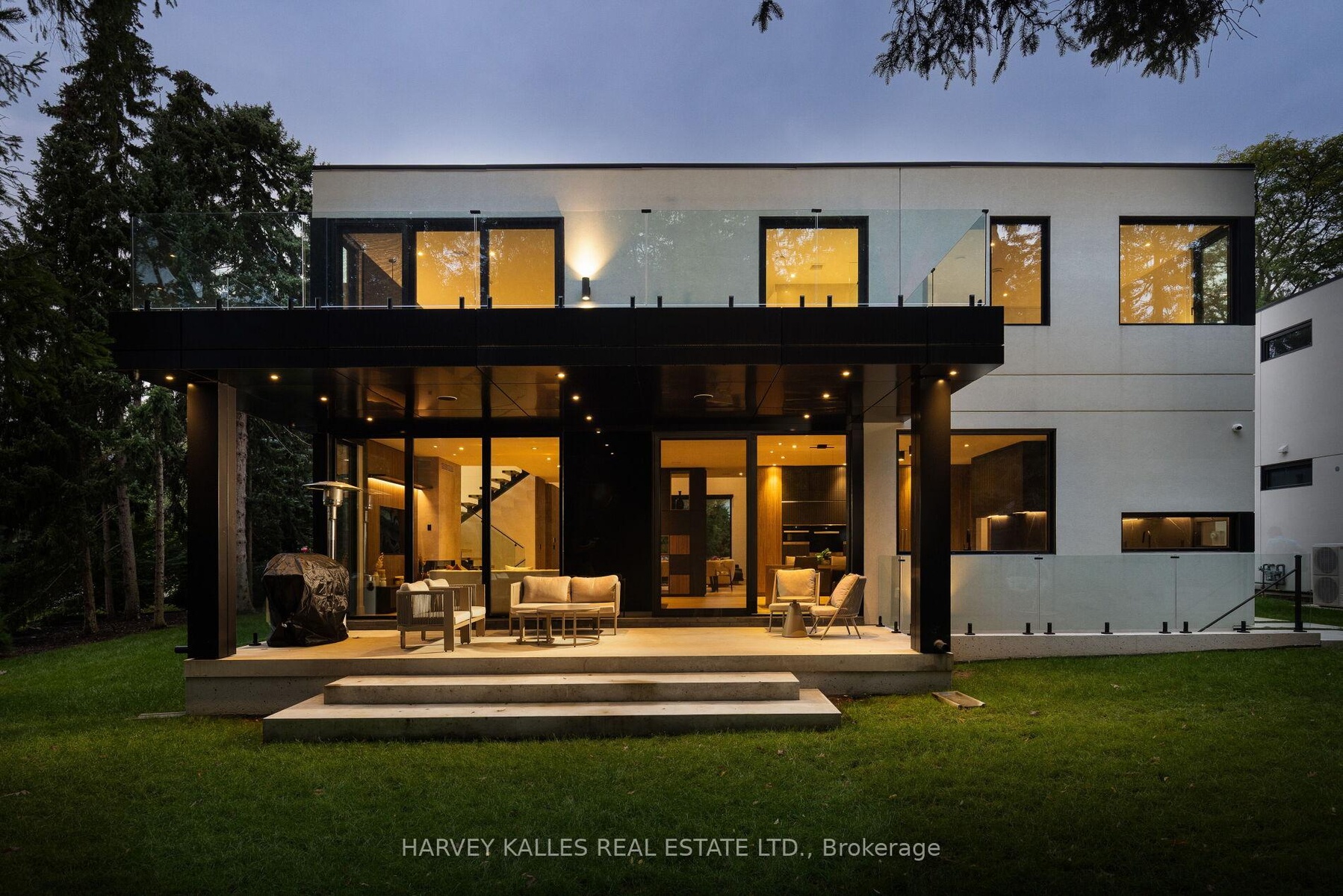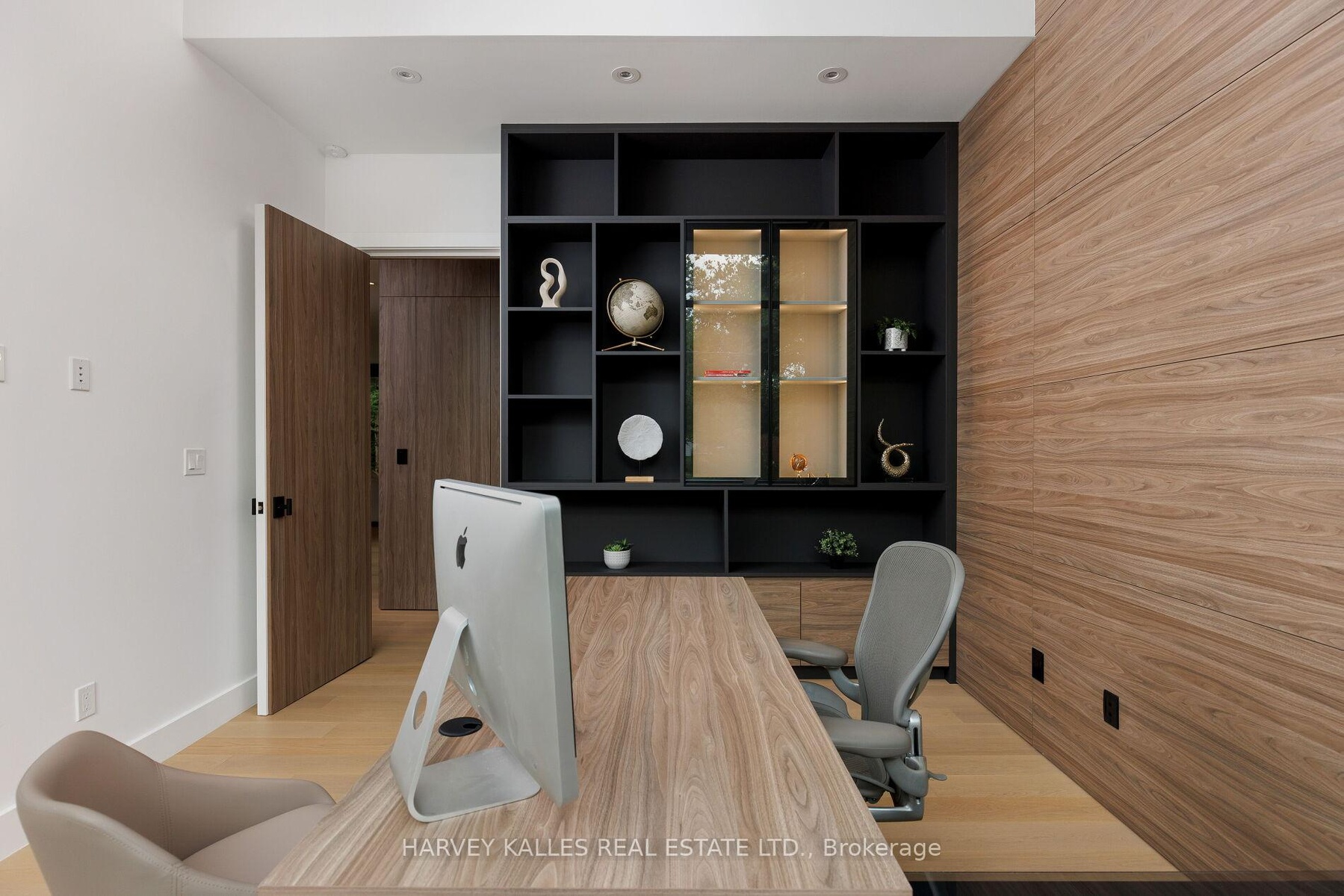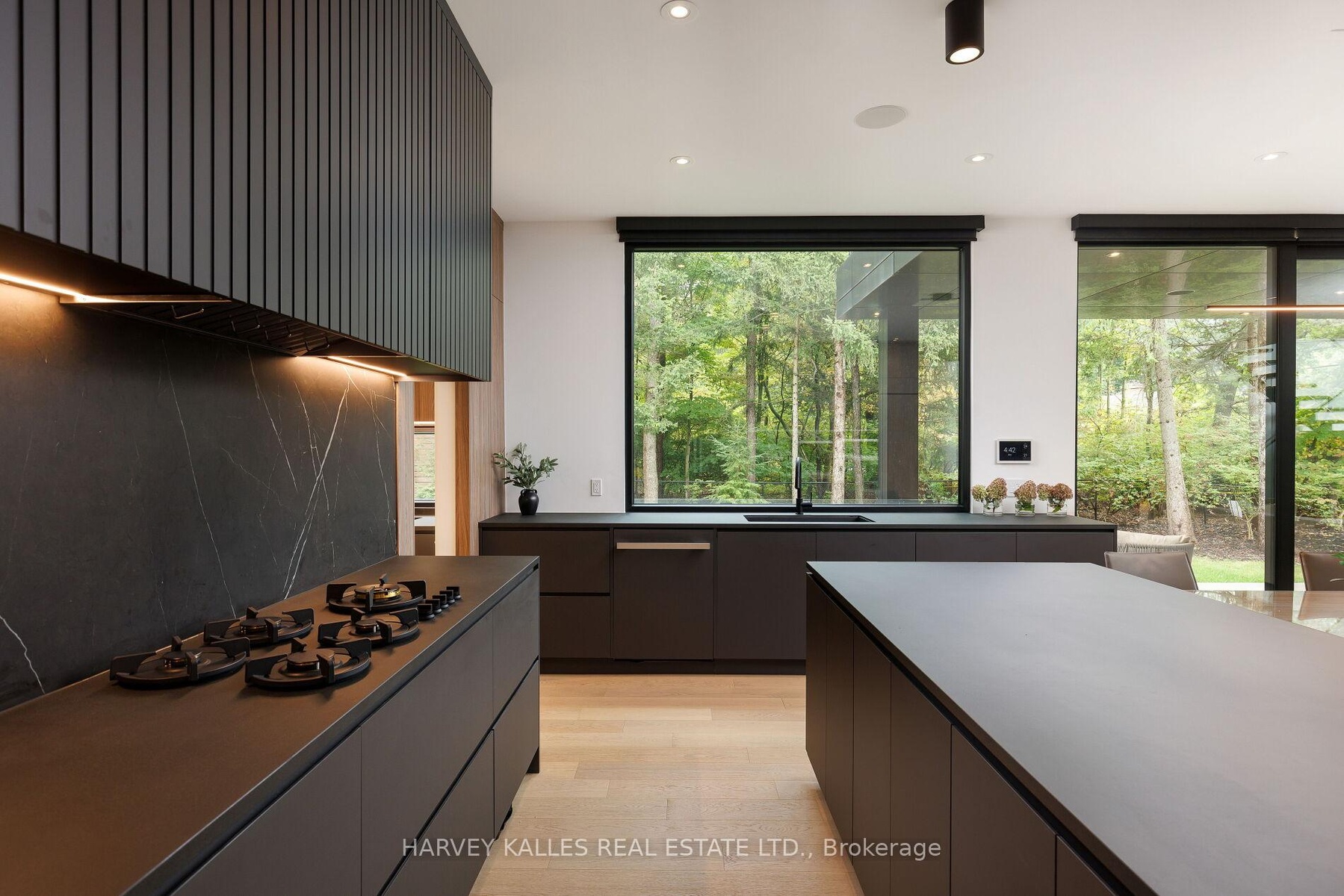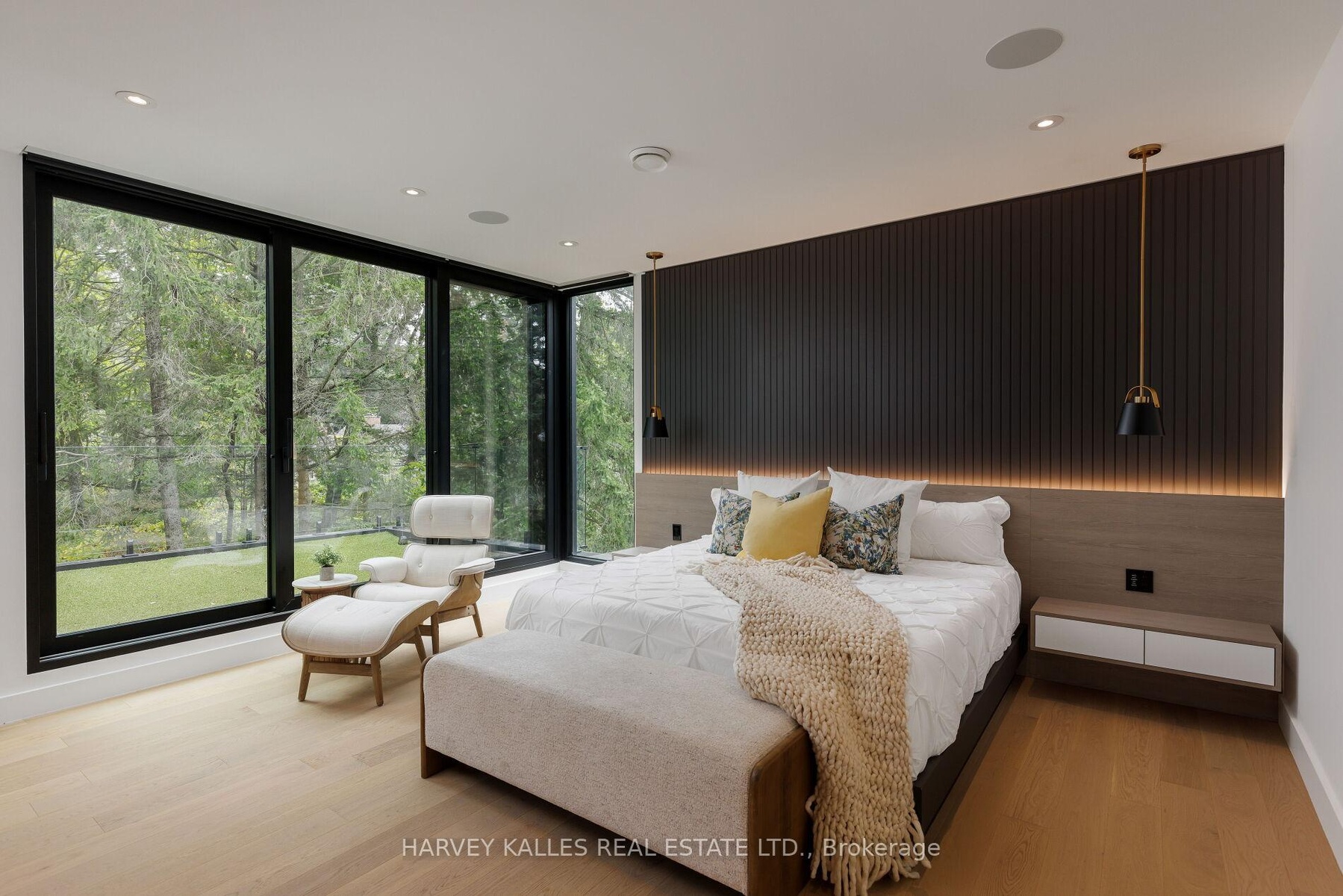 Exceptional custom residence with a masterful fusion of contemporary design with serene zen influences. 6600+ sq. ft. of finished living space, carefully crafted over four years. Dramatic 20-foot foyer with its illuminated glass pivot door, with expansive light-filled spaces highlighted by a floating staircase, architectural feature panel walls, and warm custom millwork. On the main level, a modern family room with a striking two-sided linear fireplace provides both comfort and sophistication, while the bespoke executive office offers custom millwork and gorgeous treetop views. The chefs kitchen is a true showpiece, featuring Miele appliances, a PITT gas counter range, and a separate catering kitchen. A stylish powder room, skylights, heated floors, and refined cabinetry complete the main level.The primary suite is your private retreat with a spa-inspired ensuite, custom walnut and glass walk-in closets, and a cozy lounge complete with 3-sided fireplace ambiance. Additional bedrooms feature en-suite baths and built-in cabinetry, with a flexible fourth bedroom suite that provides versatility. Your laundry room with full custom millwork completes the upper level. The lower level is an entertainment and wellness oasis ... 15-seat soundproof theatre, glass-walled temperature-controlled wine cantina, open-concept gym, and a sleek wet bar create the ultimate space for relaxation and hosting. A nanny or guest suite with a spa-like ensuite and direct walkout to the landscaped grounds ensures comfort and privacy for extended stays. The exterior showcases modern brick and aluminum cladding, beautifully landscaped grounds with irrigation, and sleek architectural lighting. Technology is seamlessly integrated with a Control4 smart home automation system, delivering comfort, convenience, and efficiency at your fingertips.This is more than a home it is a contemporary zen oasis, where design, technology, and tranquility converge to create a sanctuary for modern living.