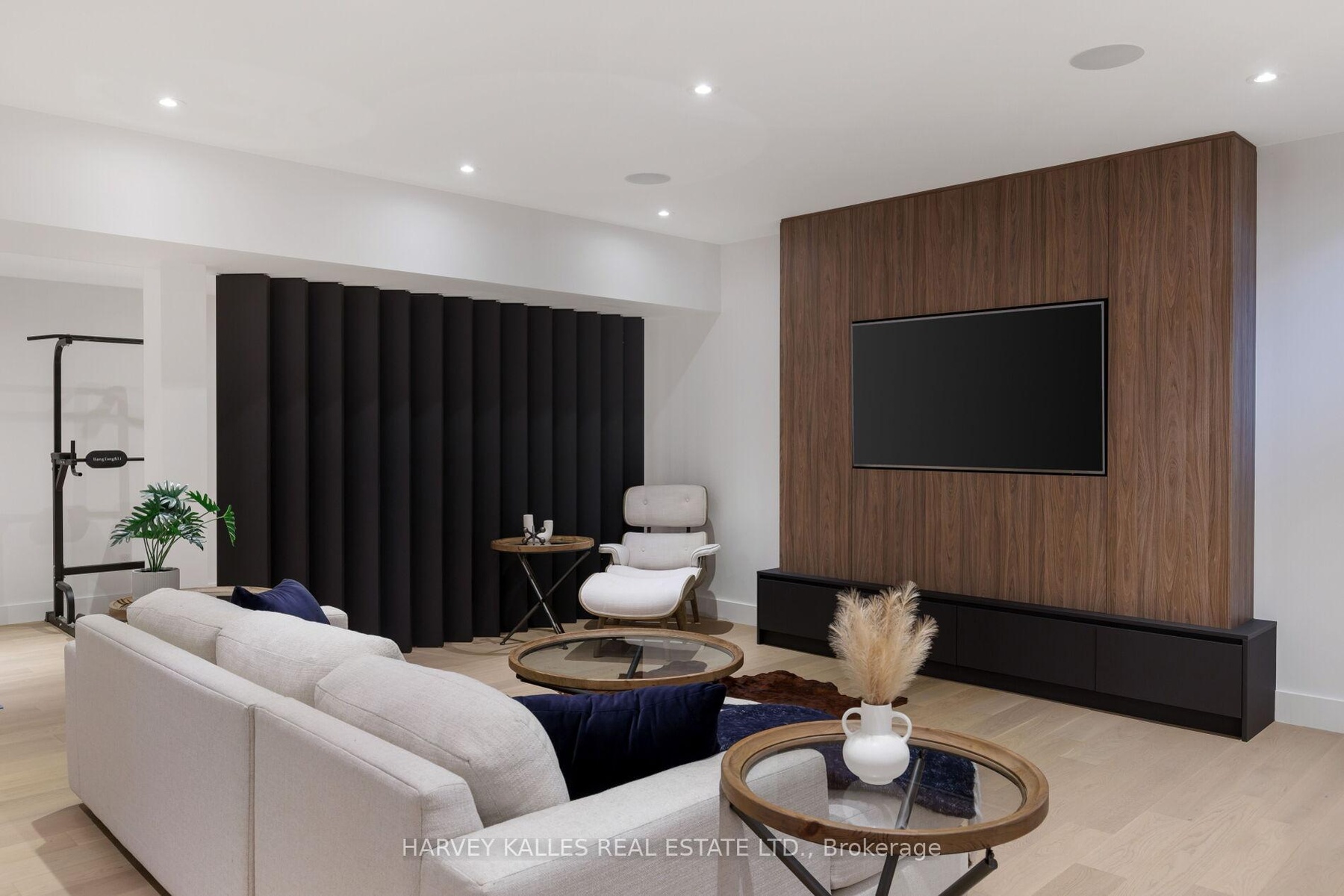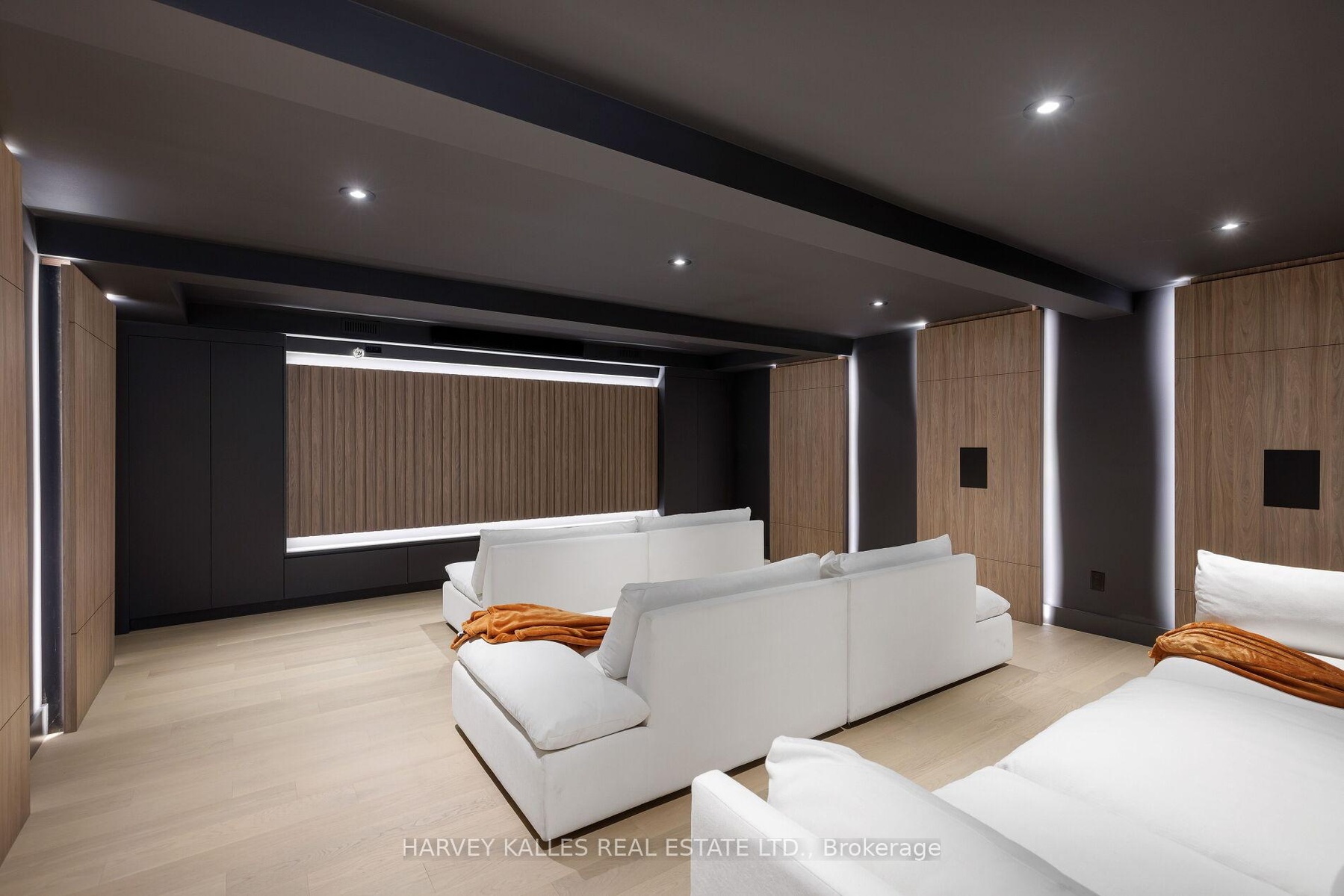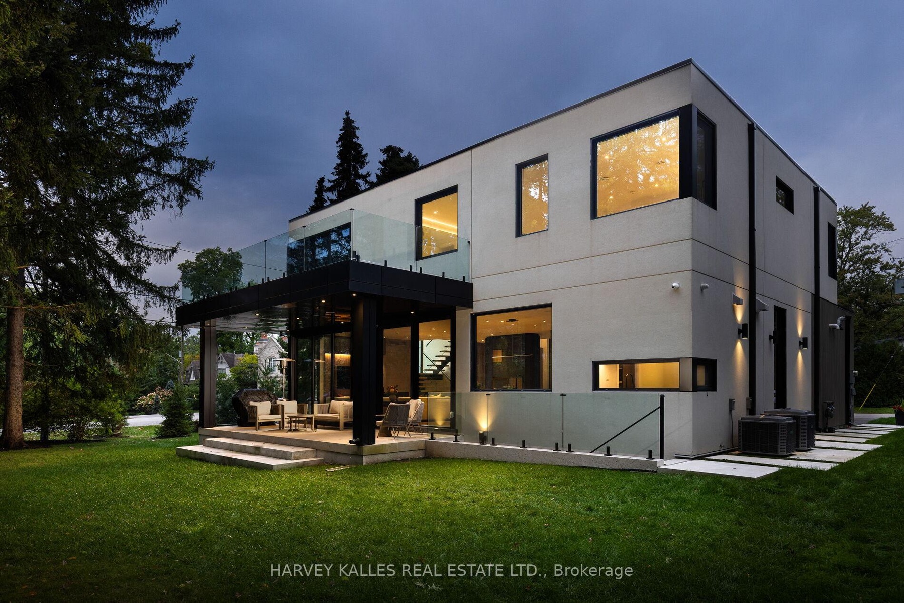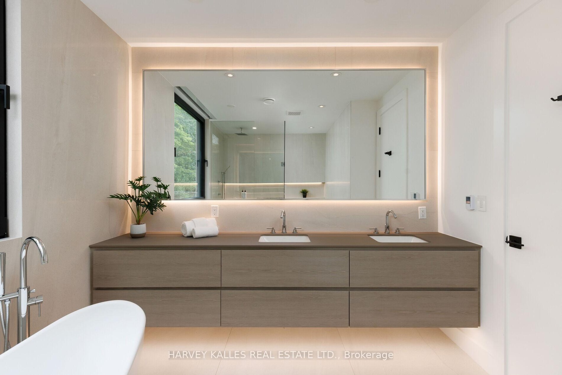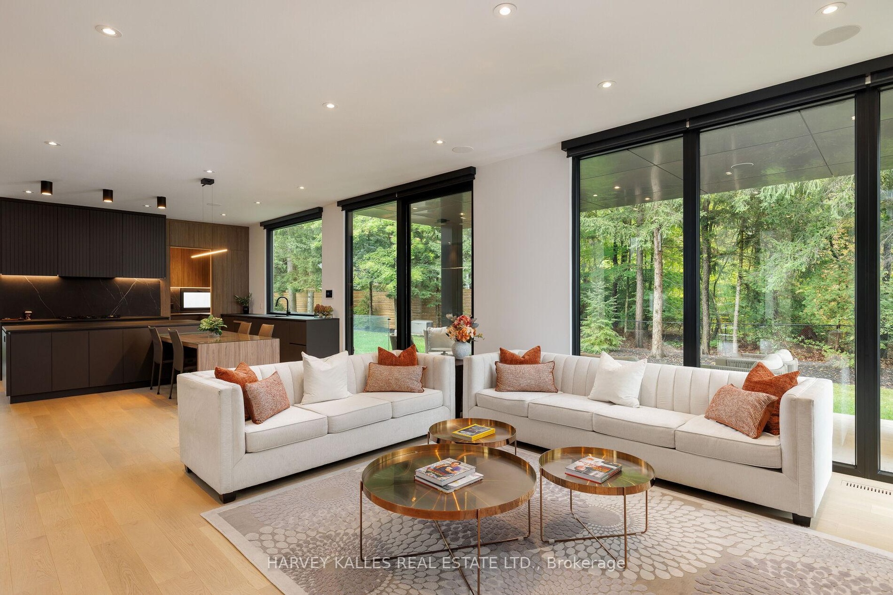 Exceptional custom residence with a masterful fusion of contemporary design with serene zen influences. 6600+ sq. ft. of finished living space, carefully crafted over four years. Dramatic 20-foot foyer with its illuminated glass pivot door, with expansive light-filled spaces highlighted by a floating staircase, architectural feature panel walls, and warm custom millwork. On the main level, a modern family room with a striking two-sided linear fireplace provides both comfort and sophistication, while the bespoke executive office offers custom millwork and gorgeous treetop views. The chefs kitchen is a true showpiece, featuring Miele appliances, a PITT gas counter range, and a separate catering kitchen. A stylish powder room, skylights, heated floors, and refined cabinetry complete the main level.The primary suite is your private retreat with a spa-inspired ensuite, custom walnut and glass walk-in closets, and a cozy lounge complete with 3-sided fireplace ambiance. Additional bedrooms feature en-suite baths and built-in cabinetry, with a flexible fourth bedroom suite that provides versatility. Your laundry room with full custom millwork completes the upper level. The lower level is an entertainment and wellness oasis ... 15-seat soundproof theatre, glass-walled temperature-controlled wine cantina, open-concept gym, and a sleek wet bar create the ultimate space for relaxation and hosting. A nanny or guest suite with a spa-like ensuite and direct walkout to the landscaped grounds ensures comfort and privacy for extended stays. The exterior showcases modern brick and aluminum cladding, beautifully landscaped grounds with irrigation, and sleek architectural lighting. Technology is seamlessly integrated with a Control4 smart home automation system, delivering comfort, convenience, and efficiency at your fingertips.This is more than a home it is a contemporary zen oasis, where design, technology, and tranquility converge to create a sanctuary for modern living.