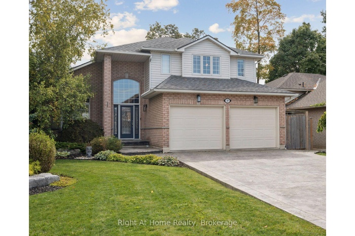 Beautiful 3+1 bedroom 4 bathroom home on an extra large lot complete with stunningly designed landscaping. Home features 15 foot vaulted ceilings in the living room with floor to ceiling natural stone gas fireplace and hardwood floors. Off of the living room you will step into the updated eat in kitchen with granite countertops and two custom cabinets. The kitchen leads you to the private rear yard with mature trees, in-ground swimming pool and stamped concrete patio. Second floor offers large master suite with walk-in closet and ensuite bath, and 2 good sized bedrooms. Fully finished basement adds plenty of additional space with family room, full bathroom, 4th bedroom, and utility/storage space. Quiet family friendly neighbourhood. Double car garage and stamped concrete driveway add that extra bonus! Close to parks, schools, community centre, river, and shopping.