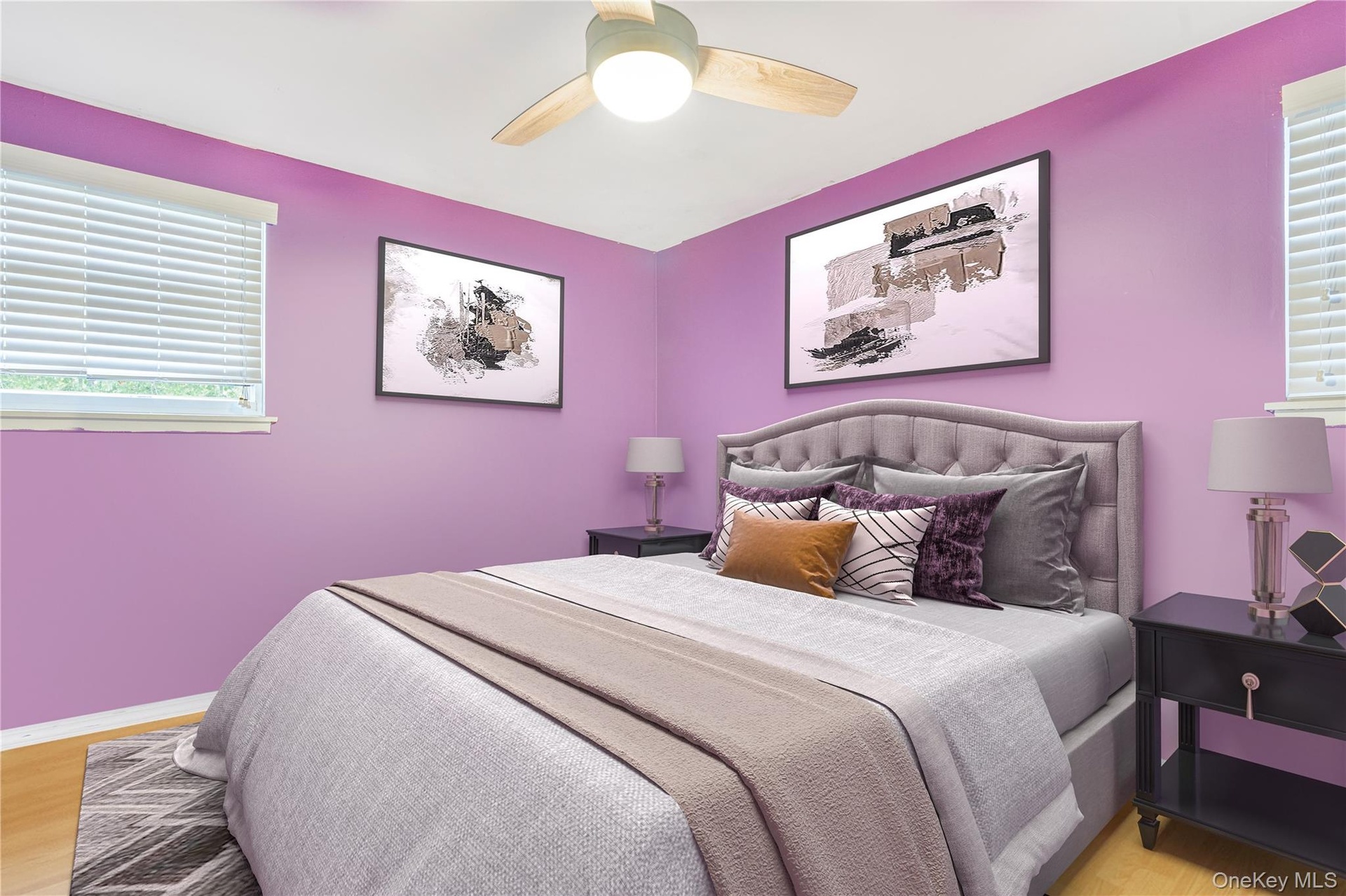 - Bedroom featuring light wood-style flooring, baseboard heating, and ceiling fan