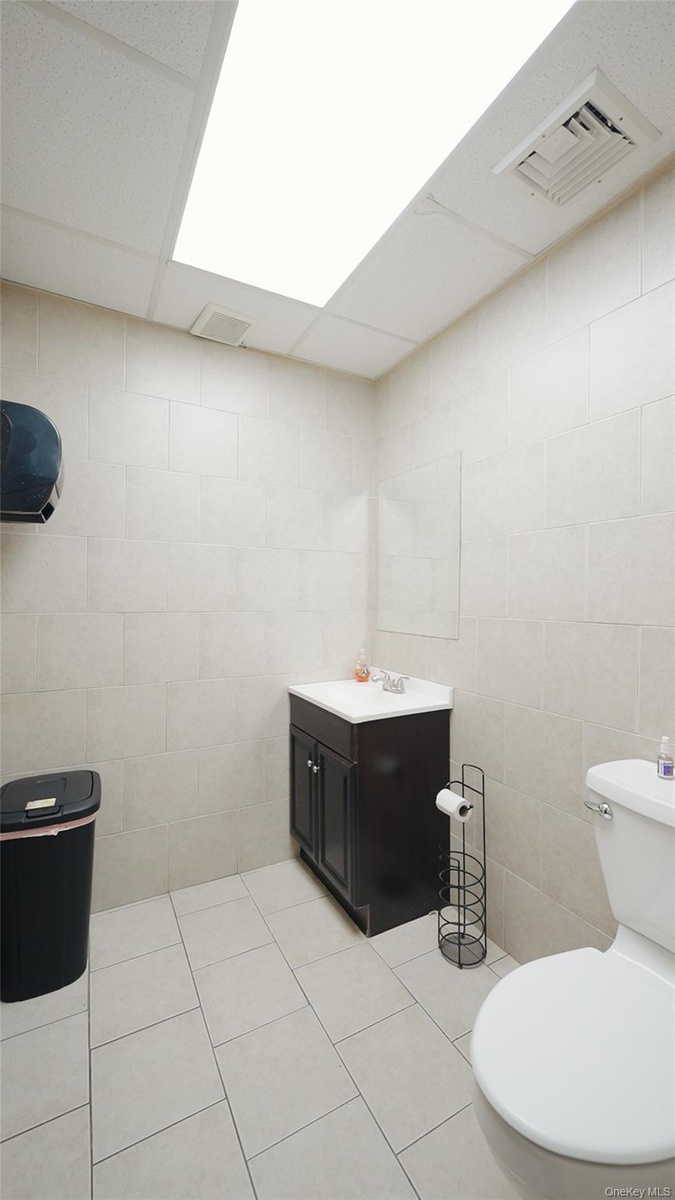 - Bathroom with a drop ceiling, vanity, light tile patterned floors, tile walls, and wainscoting