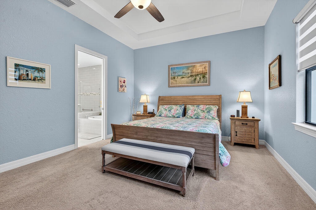Welcome to Copperleaf - One of Palm City's Most Sought-After Communities!This beautifully maintained coastal themed Pulte Pinnacle model offers the perfect blend of luxury, comfort, and functionality--all on one spacious level. Nestled on a pie-shaped oversized lot, this 3-bedroom, 3-bath home (including 2 ensuite baths) features a split floorplan with a dedicated home office adorned with custom barn doors, ideal for work or quiet retreat.The heart of the home is the open-concept, upgraded kitchen, boasting taller cabinets, an expanded center island, and ample space for entertaining. Impact windows throughout offer peace of mind, while allowing natural light to pour in.Step outside to your private, screened pool area with crosswind heat pump. The serene