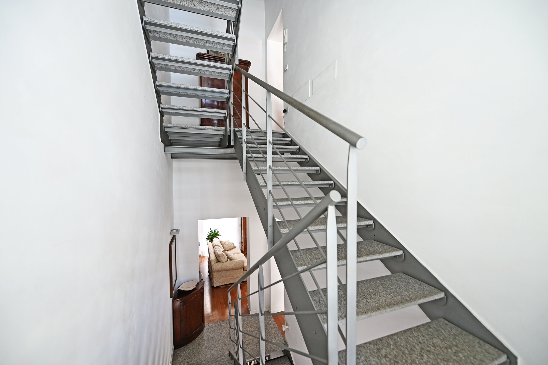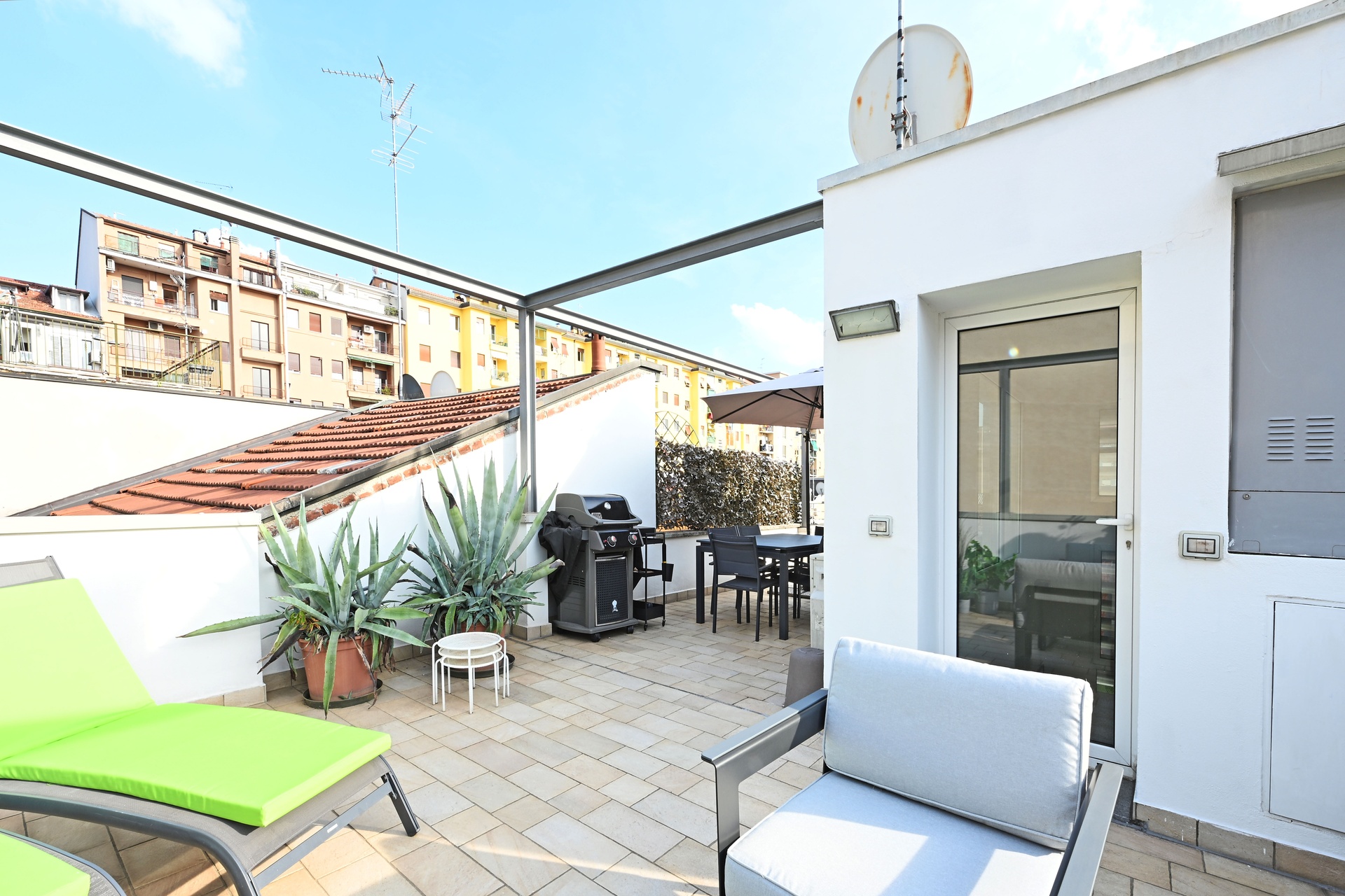 The staircase leads to the splendid terrace above, designed for parties, barbecues, and aperitifs, but also ideal for a delightful roof garden.