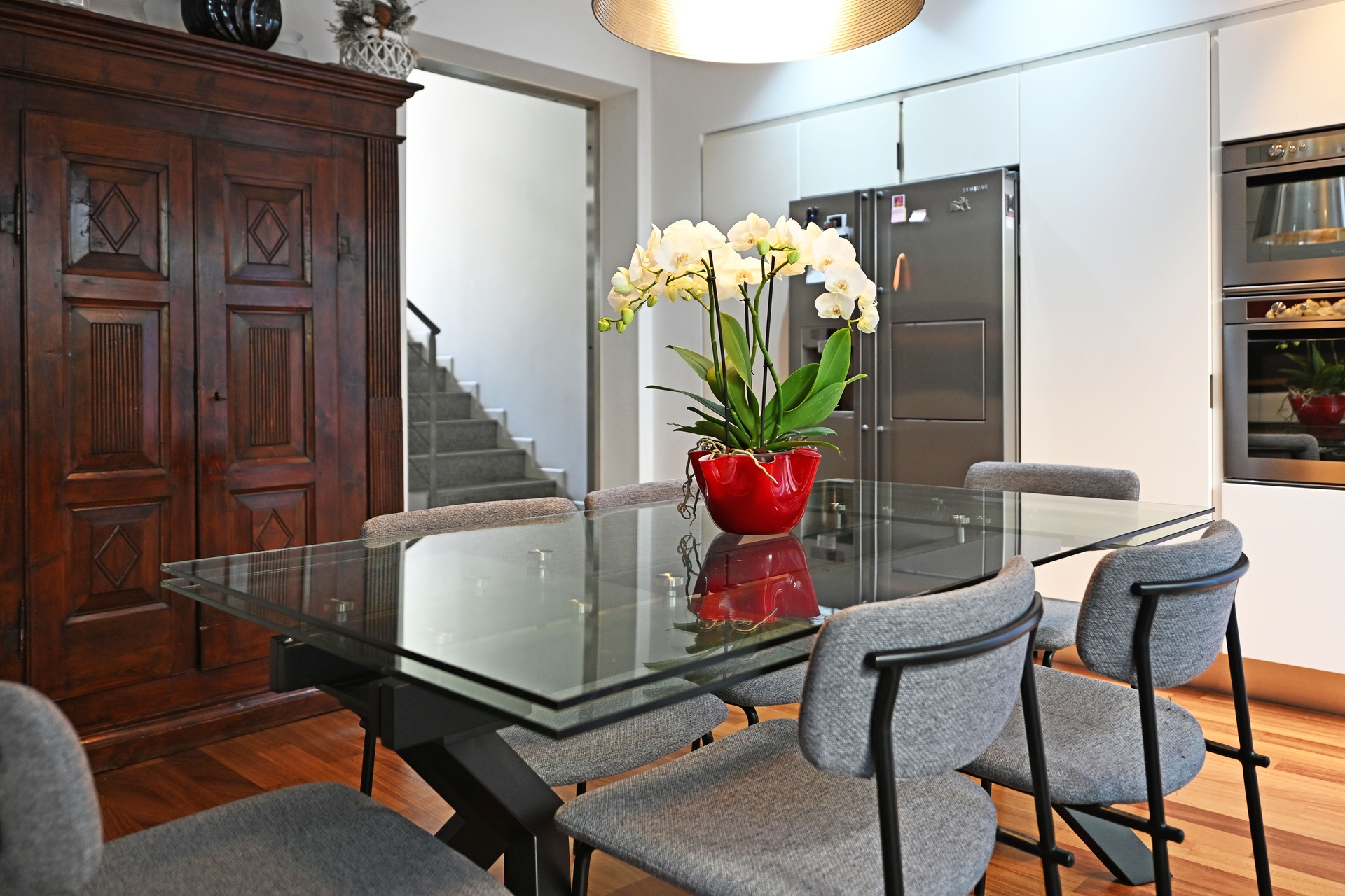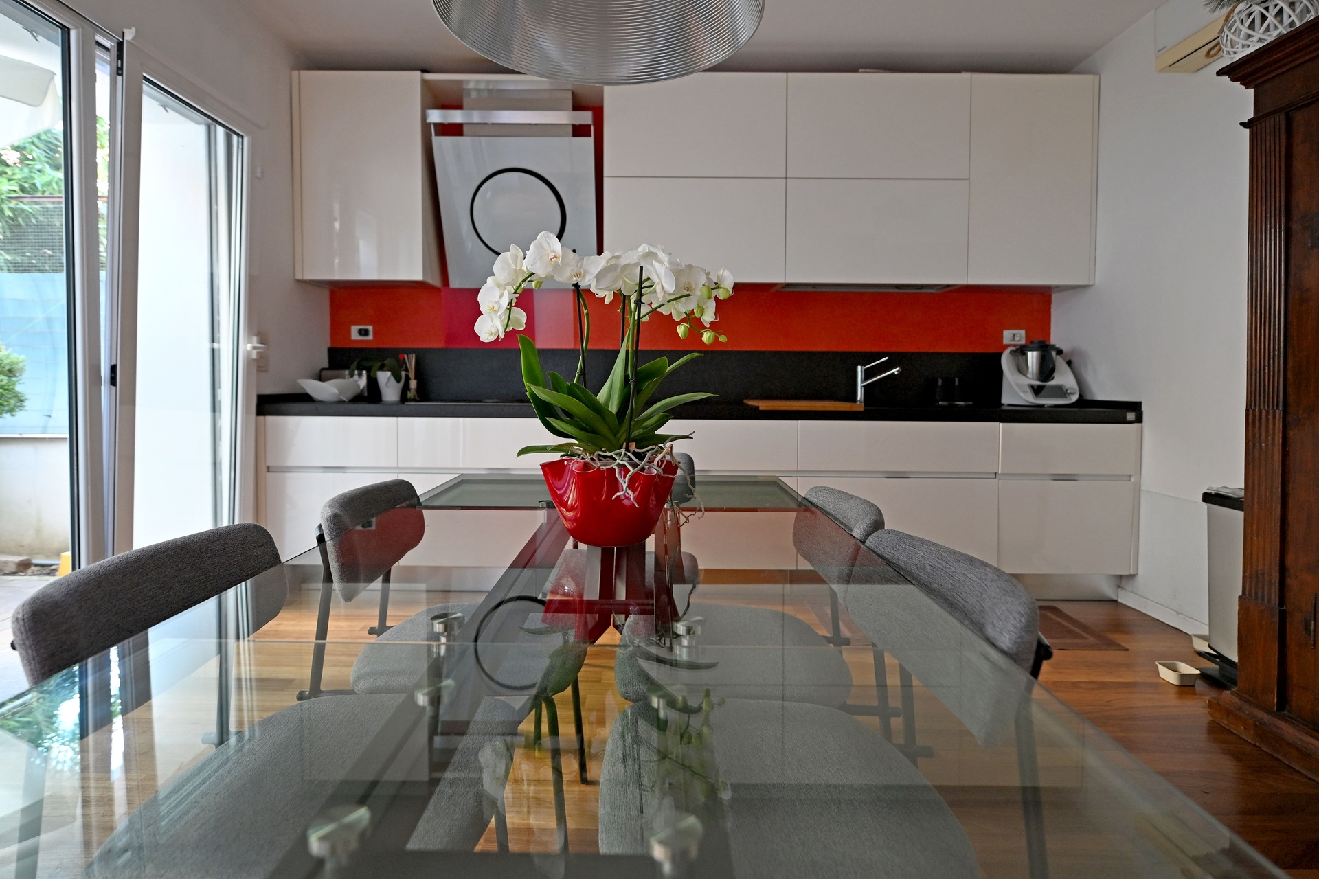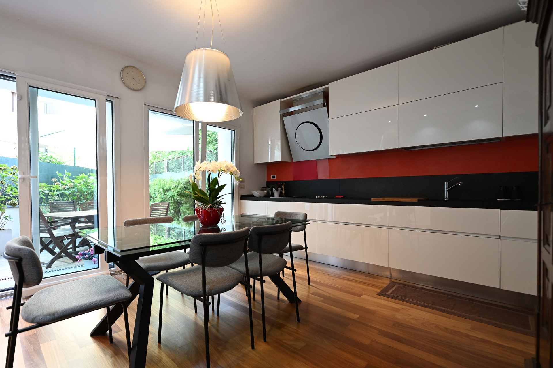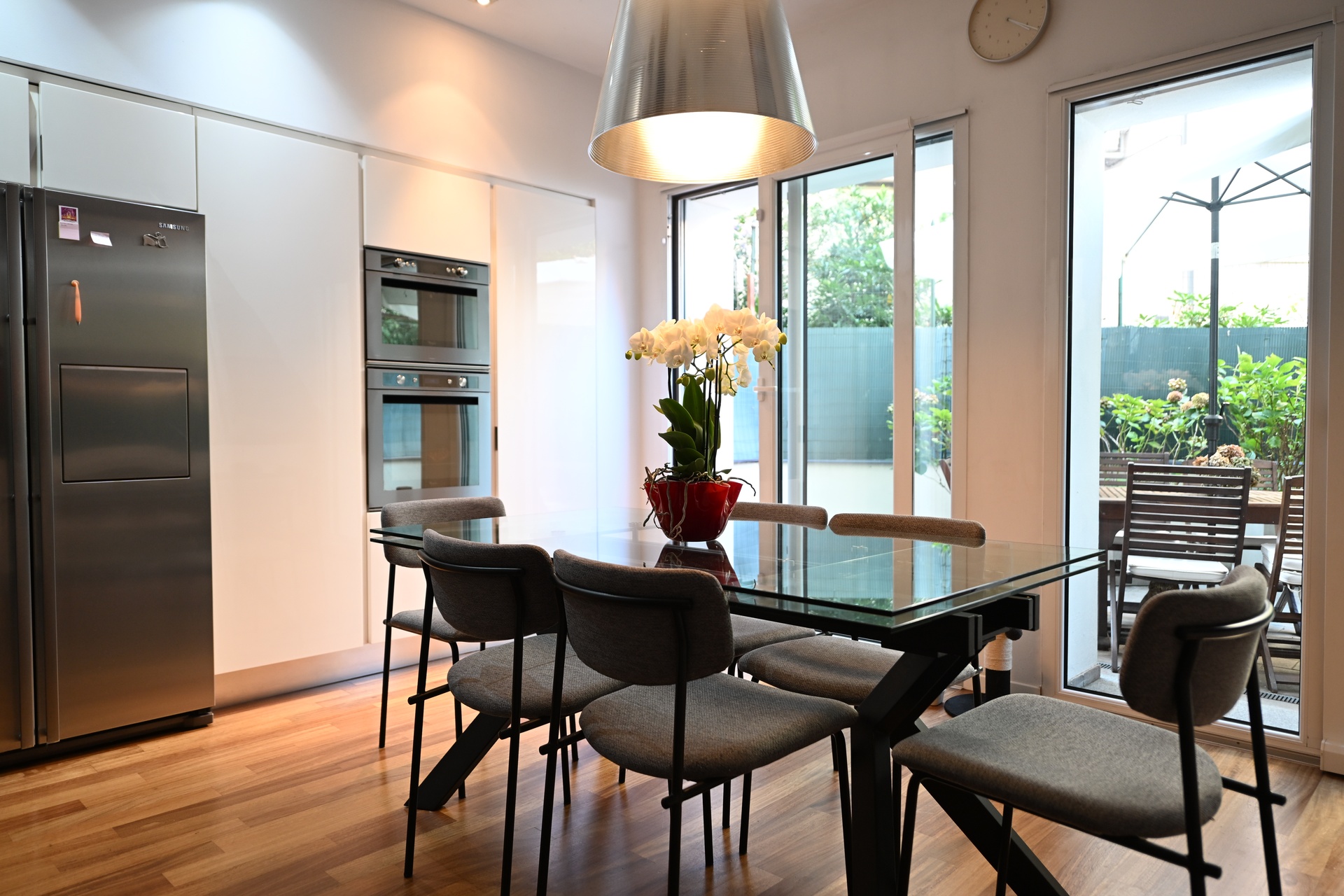 On the ground floor, the dining area with its elegant open-plan kitchen opens through floor-to-ceiling windows onto an outdoor space ideal for lunches and dinners with family and friends in the warmer months.