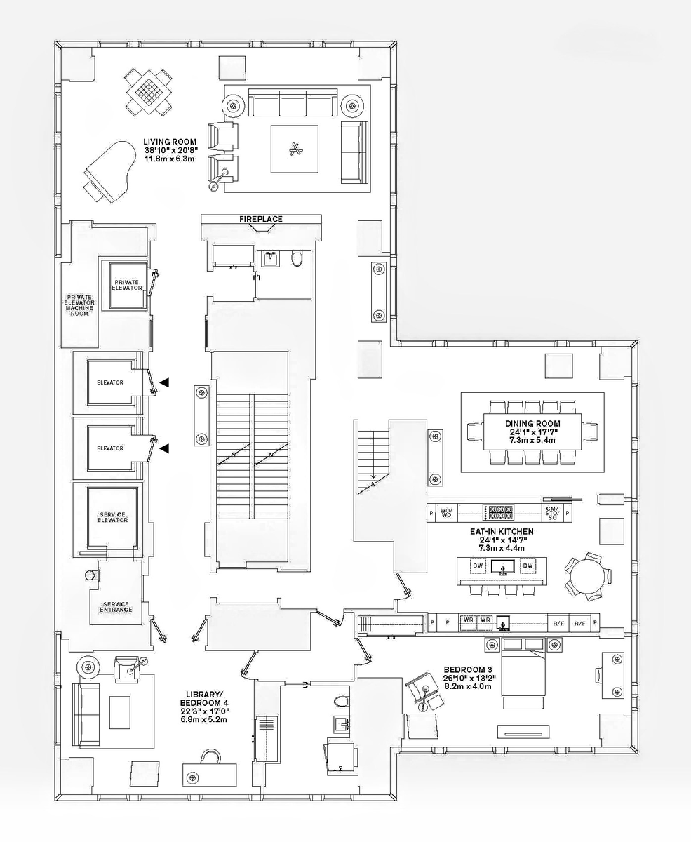 Inside, Thierry Despont’s vision takes shape across soaring spaces and tailored details. Ceilings reach at 22 FT in the double-height great room, where a monumental limestone fireplace anchors walls of glass framing Central Park. The custom Molteni kitchen gleams with polished statuary marble, back-painted glass cabinetry, and professional-grade appliances by Miele and Sub-Zero. Every detail is executed with precision and quiet drama.