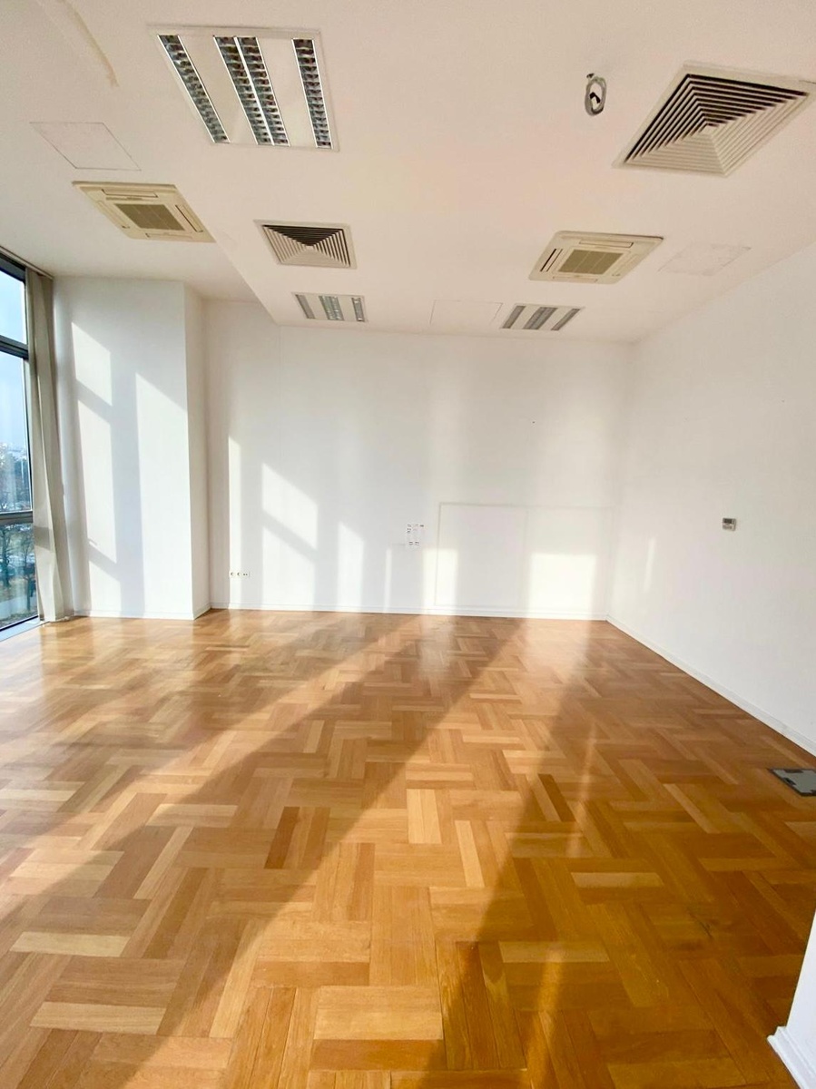 The space covers 430 m2 and is located on the second floor of a modern mixed-use building constructed in 2011, with access provided by two elevators, including a freight elevator. The suspended ceiling height is 3.2 m. The layout features a spacious open-plan area along with 12 separate offices divided by glass walls, creating a bright and airy working environment.