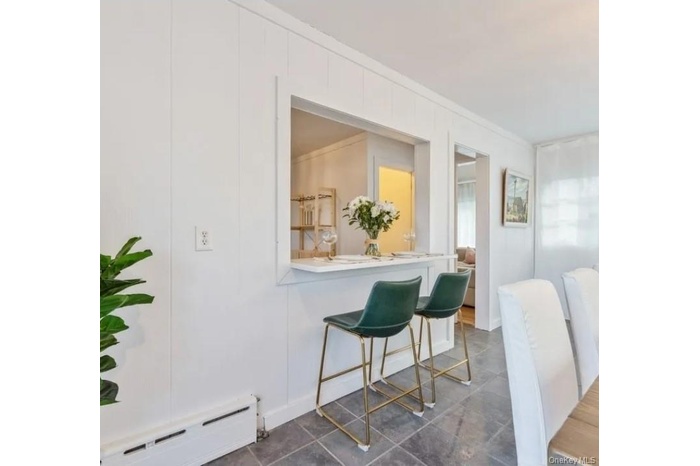 - Dining space featuring dark tile patterned flooring and a chandelier