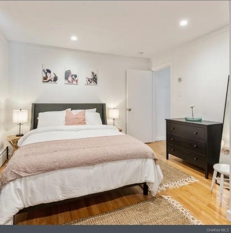 - Bedroom with light wood finished floors, a closet, a baseboard radiator, recessed lighting, and ornamental molding