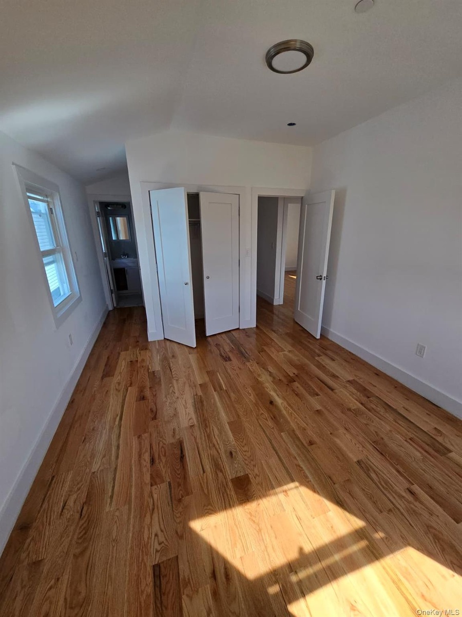 - Unfurnished bedroom with light wood-style flooring, a closet, and vaulted ceiling
