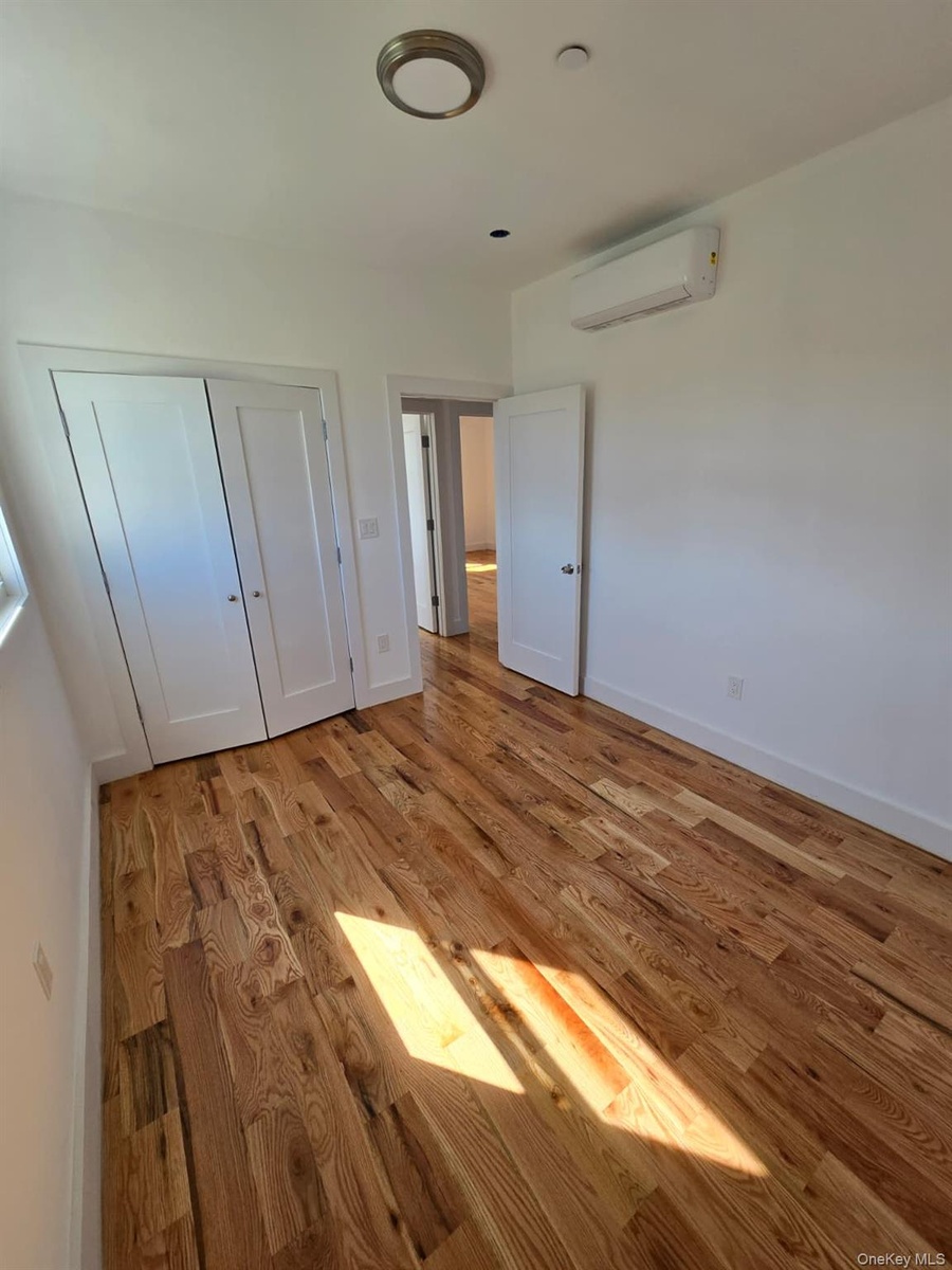 - Unfurnished bedroom featuring wood finished floors, a closet, and an AC wall unit