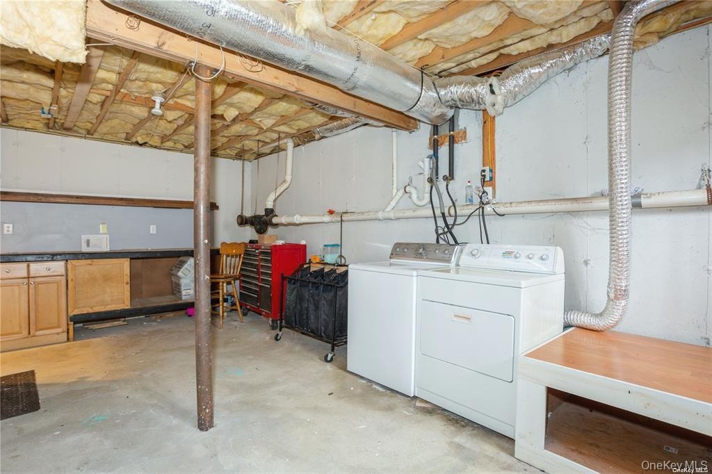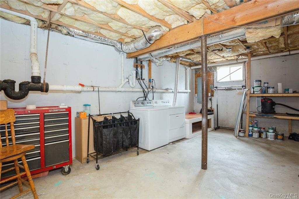 - Below grade area with a paneled ceiling, washer / clothes dryer, heating unit, and carpet flooring