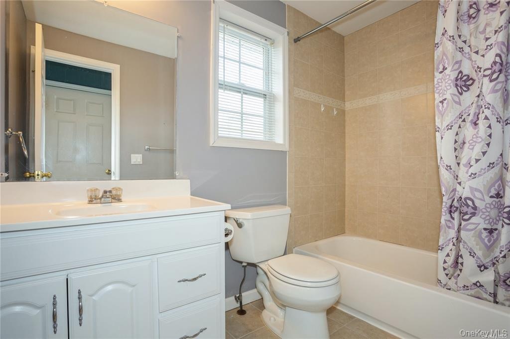 - Full bath featuring shower / tub combo with curtain, vanity, and light tile patterned floors