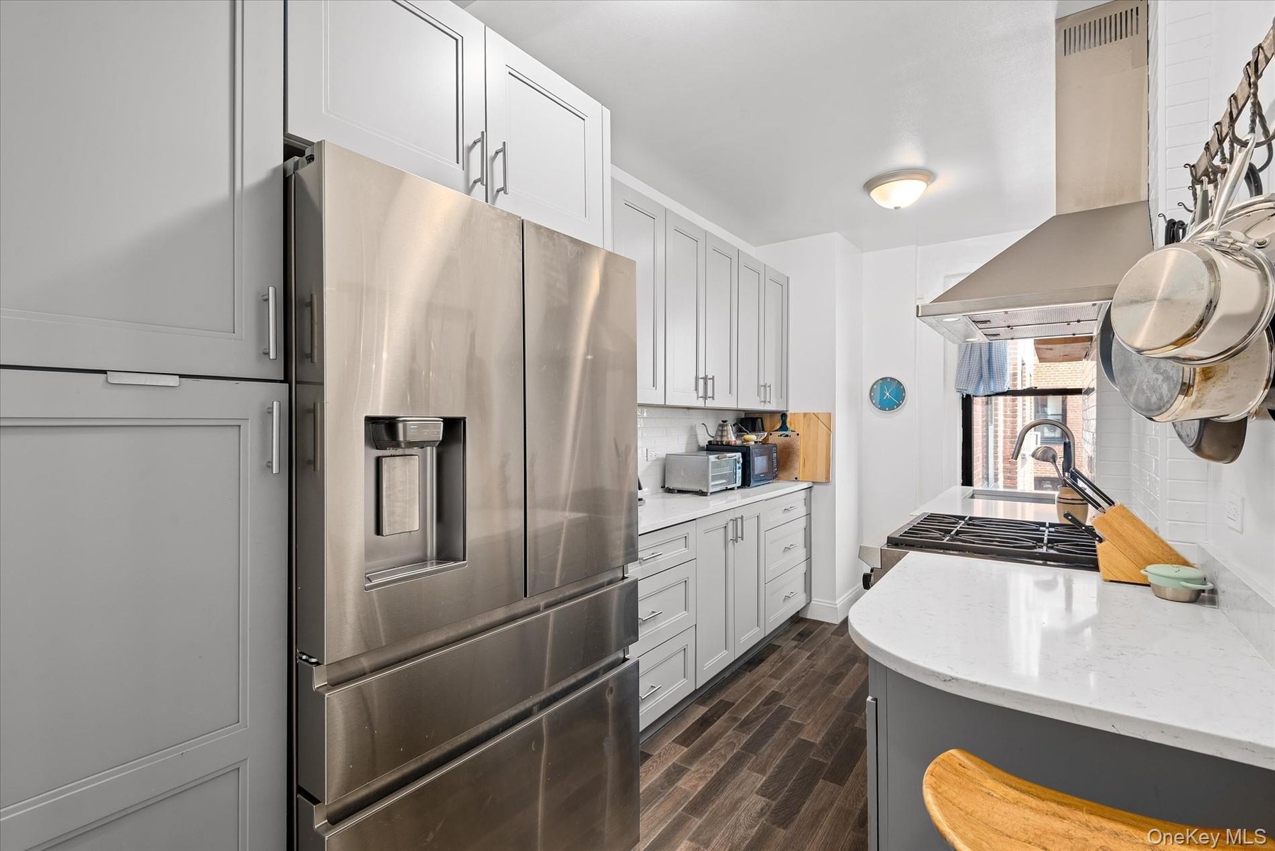 Beautifully renovated windowed kitchen with Silestone counters, Wolf stove & oven, Bosch dishwasher, Samsung French door refrigerator with water and ice dispenser. Generous storage and work space.