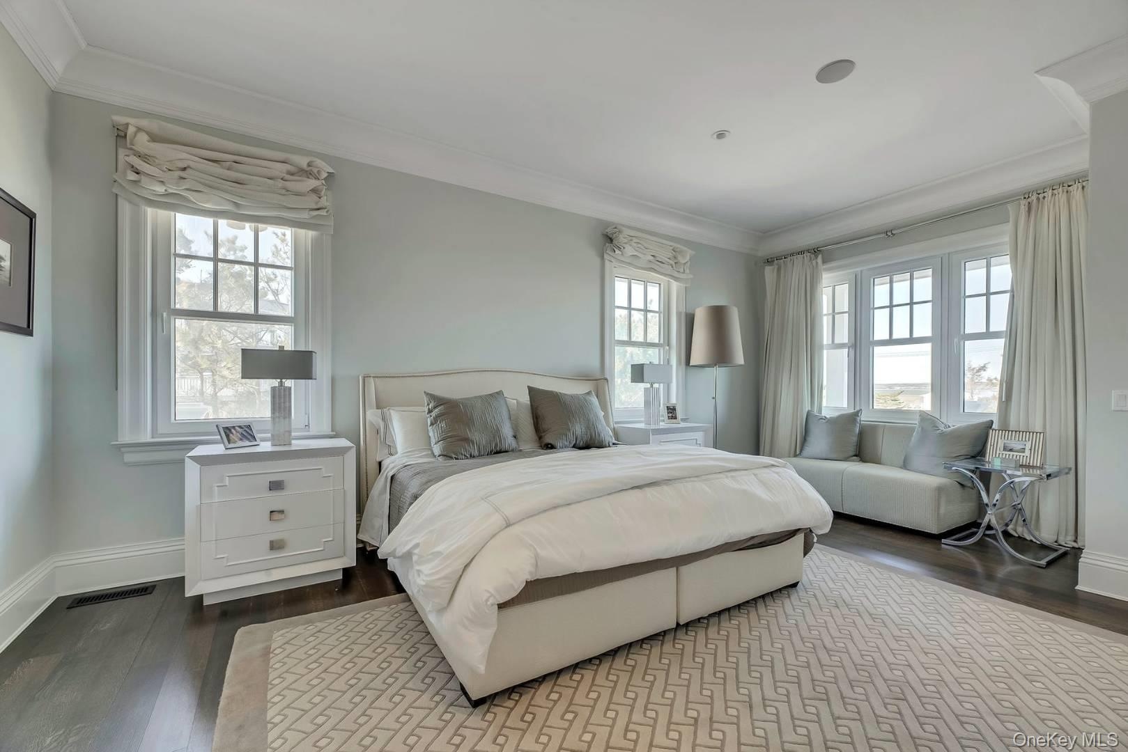 - Bedroom featuring crown molding, multiple windows, and dark wood finished floors