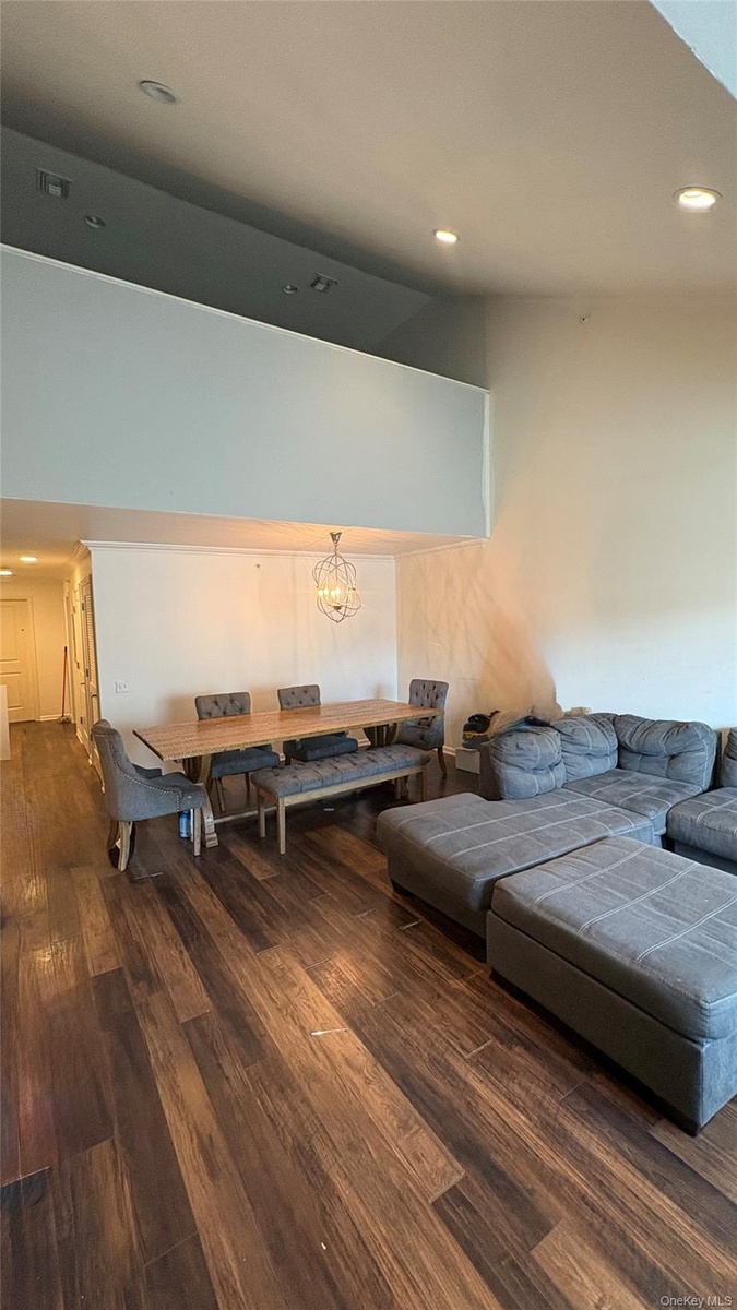 - Living room featuring recessed lighting, dark wood-type flooring, a chandelier, and a high ceiling