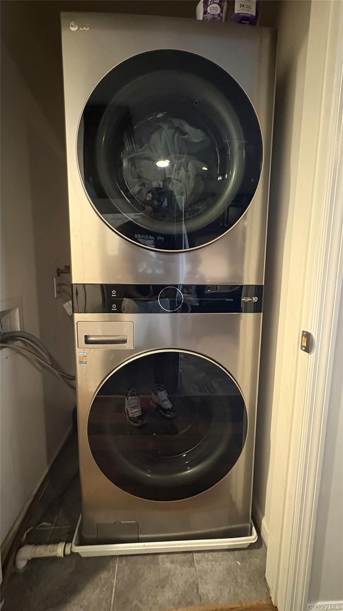 - Washroom featuring stacked washing machine and dryer and tile patterned floors