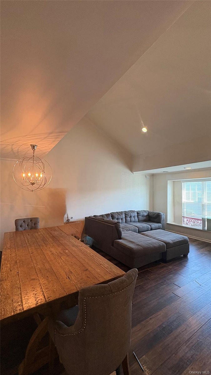 - Dining space with lofted ceiling, a chandelier, and wood finished floors