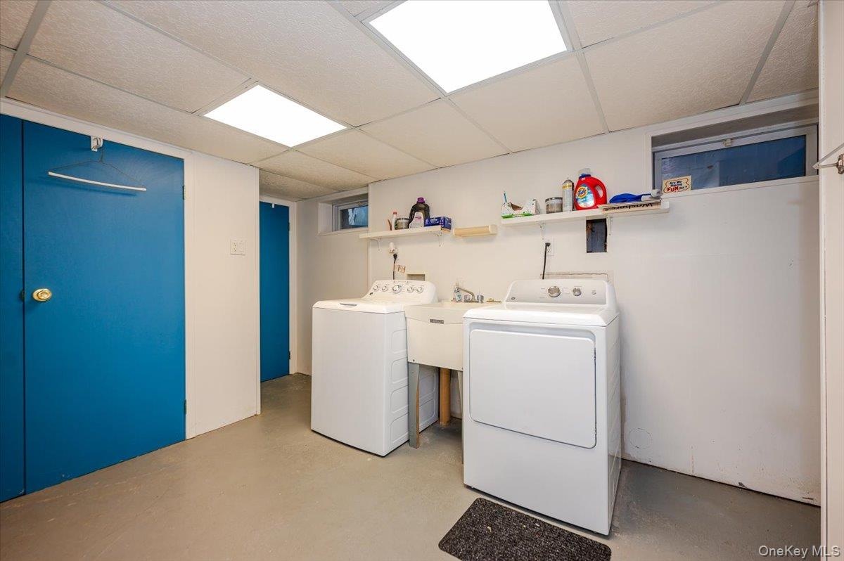 - Finished below grade area featuring a drop ceiling and freestanding refrigerator