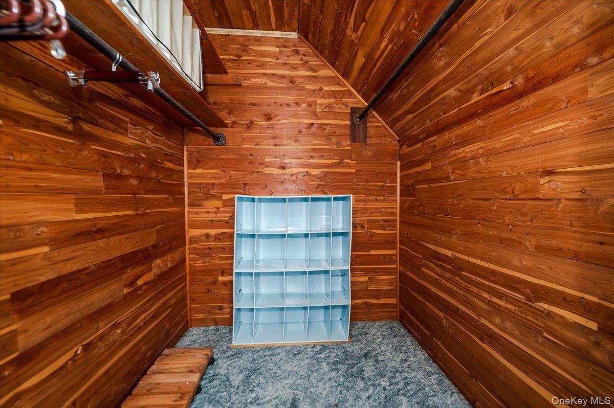 - Walk in closet with vaulted ceiling and dark colored carpet