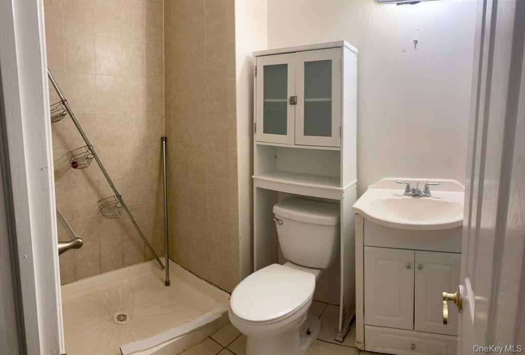 - Full bathroom with a stall shower, vanity, and light tile patterned floors