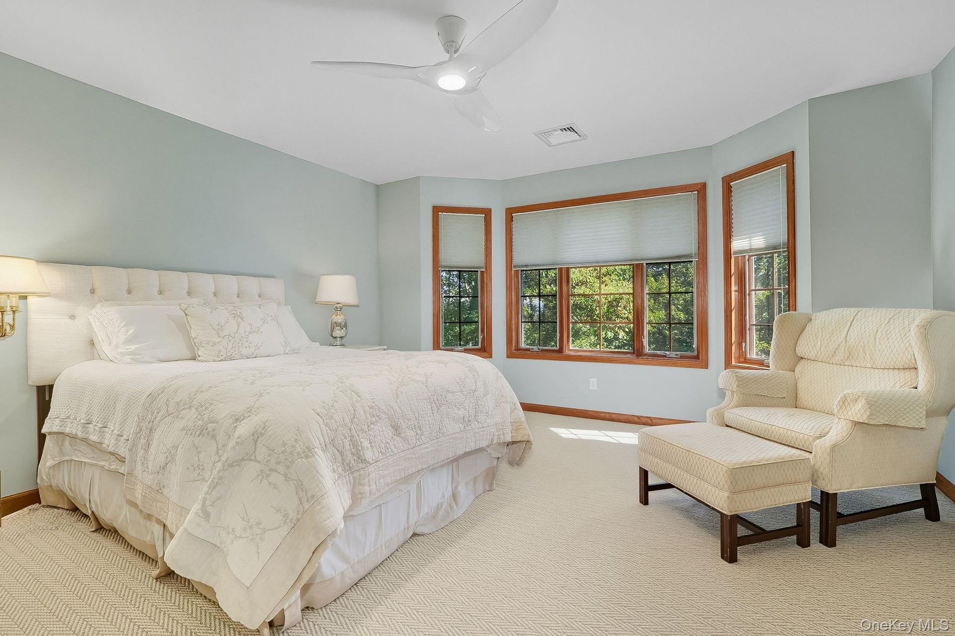 - Bedroom with a tray ceiling, ceiling fan, and light carpet