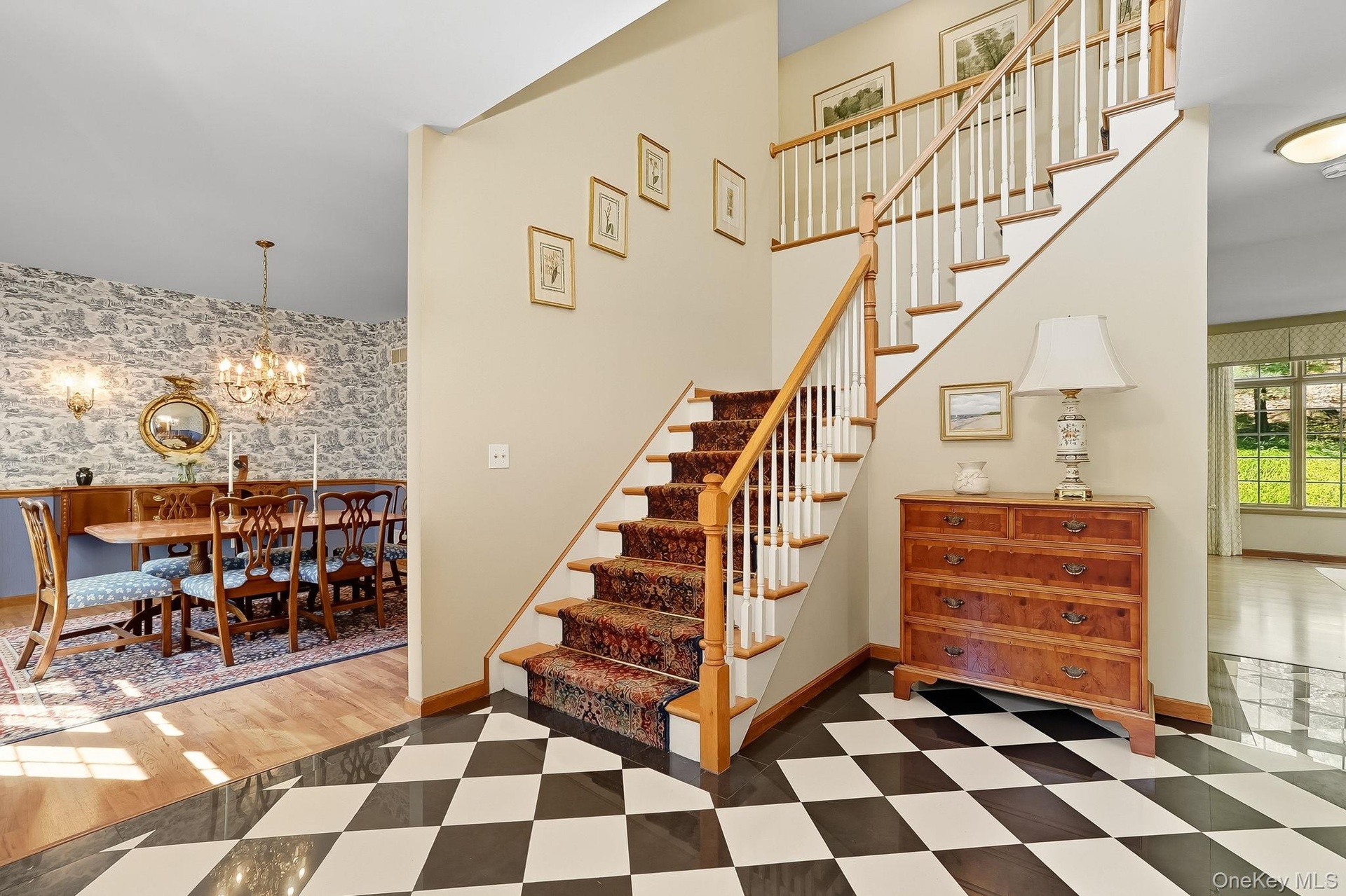 - Staircase with wallpapered walls, a chandelier, an accent wall, and a towering ceiling
