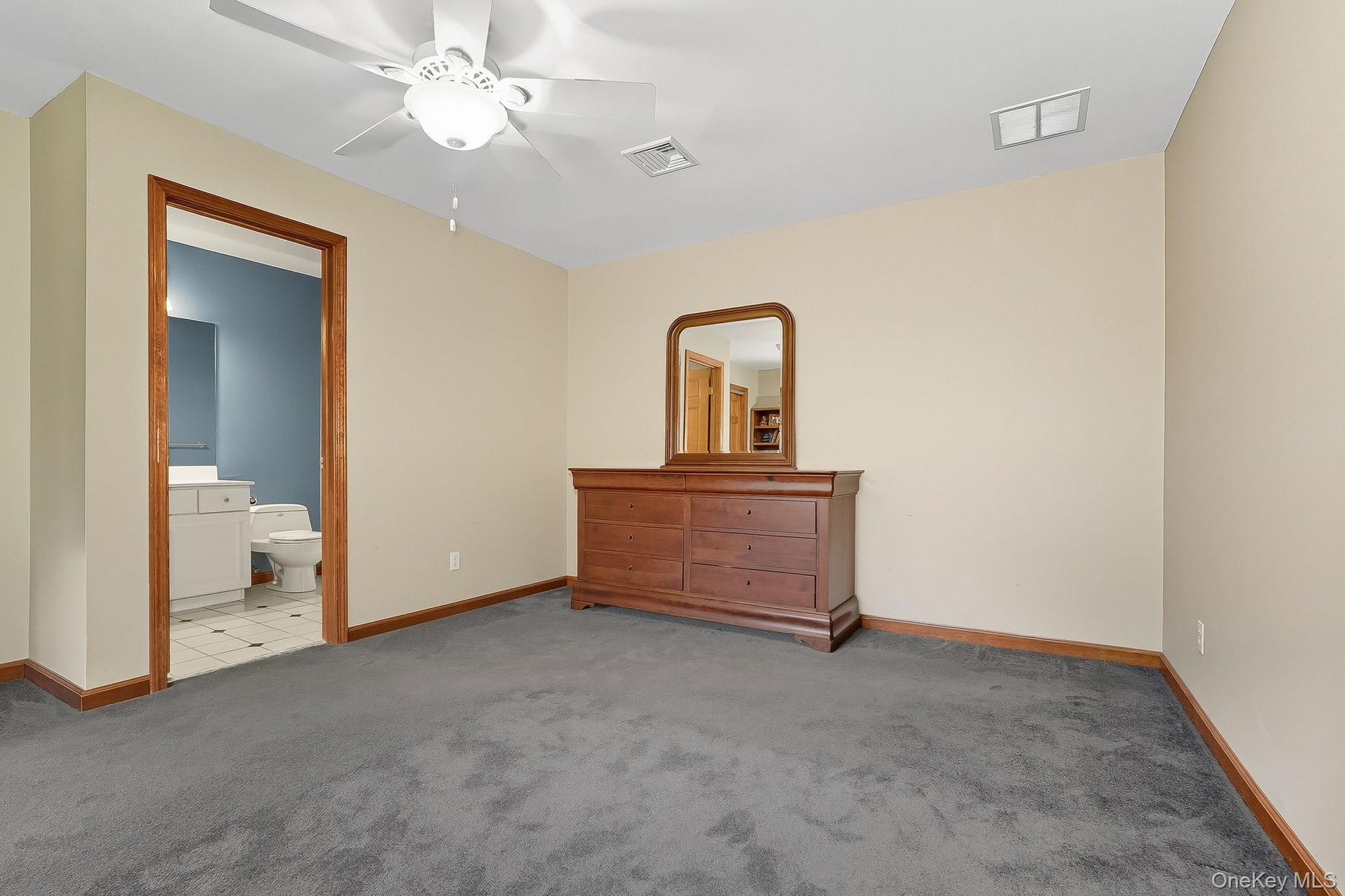 - Unfurnished bedroom featuring light carpet, ceiling fan, and ensuite bath