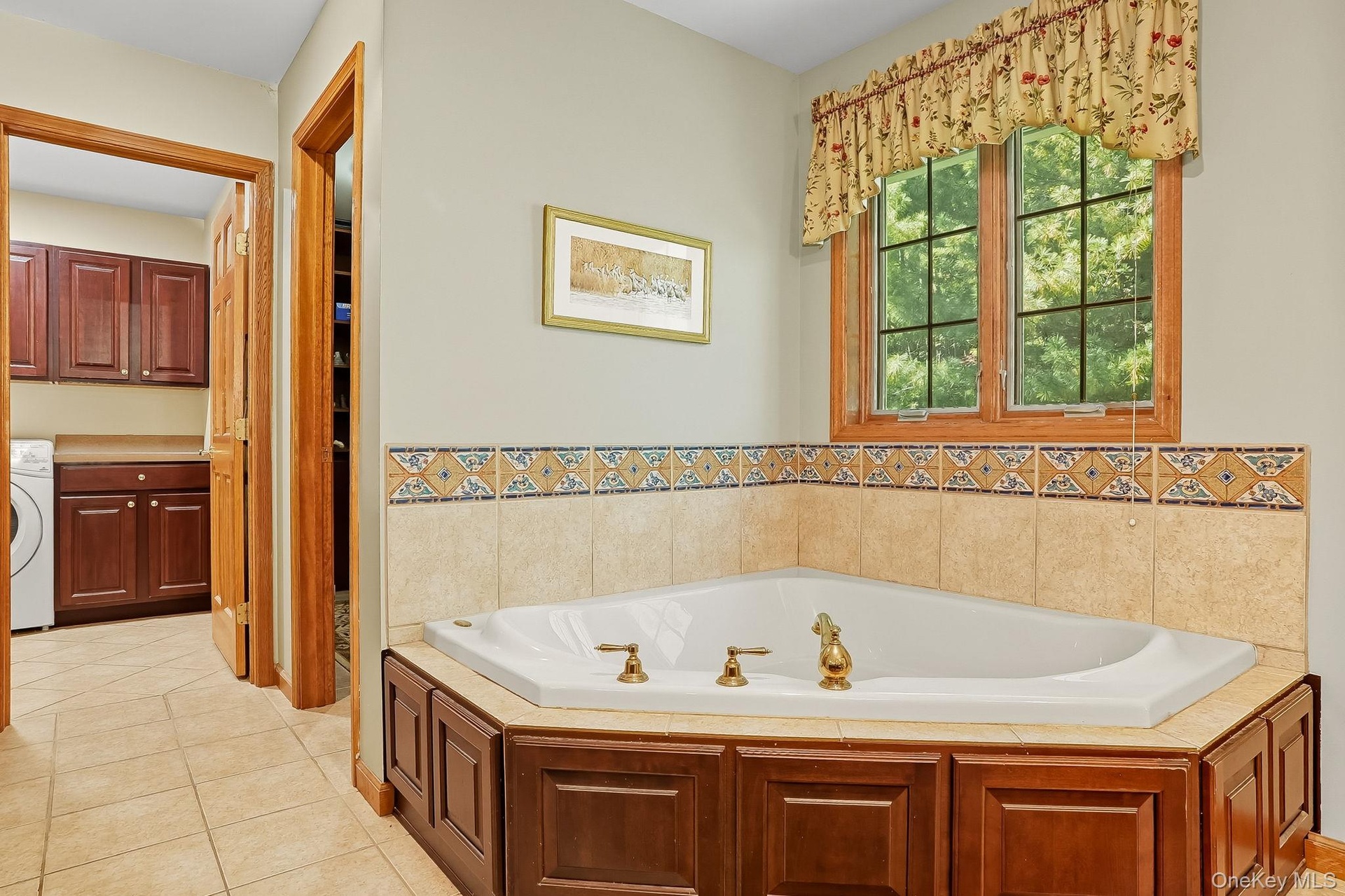 - Full bathroom featuring a tub with jets, light tile patterned flooring, and washer / dryer