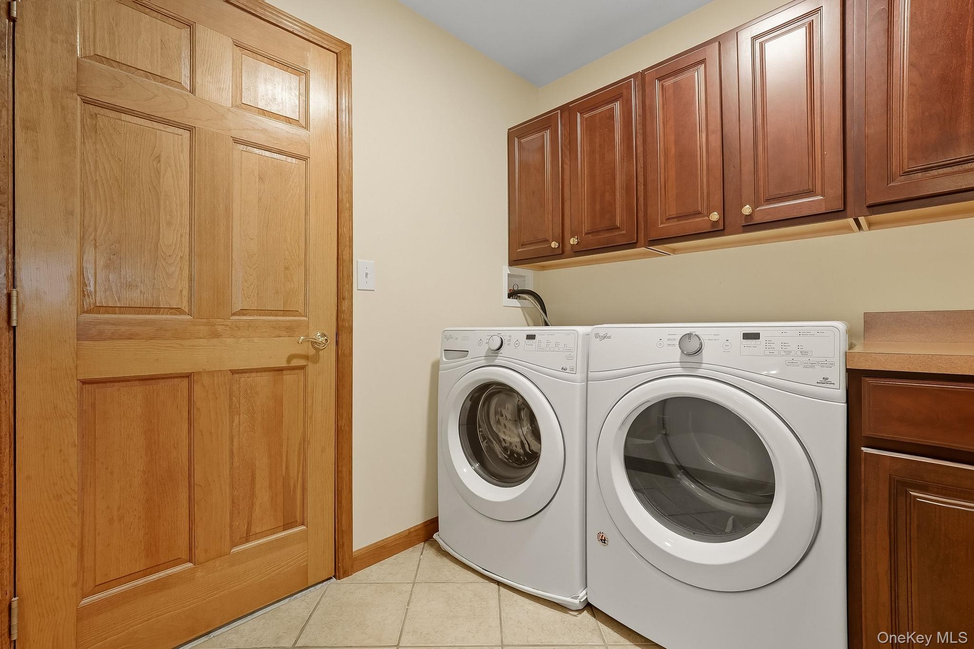 - Washroom featuring light tile patterned floors, cabinet space, and washer and dryer