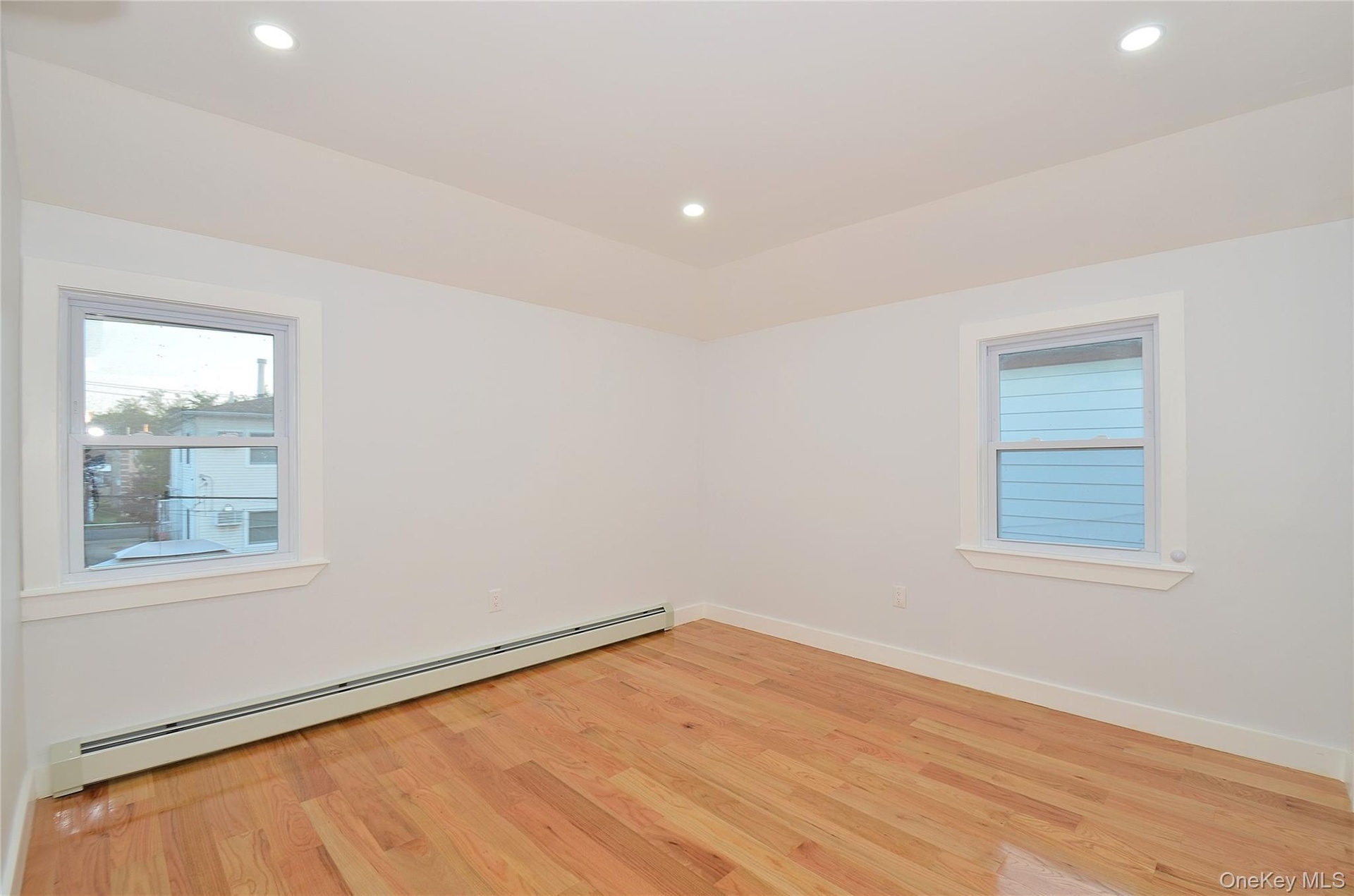 - Bedroom with a baseboard radiator, light wood-type flooring, recessed lighting, and healthy amount of natural light