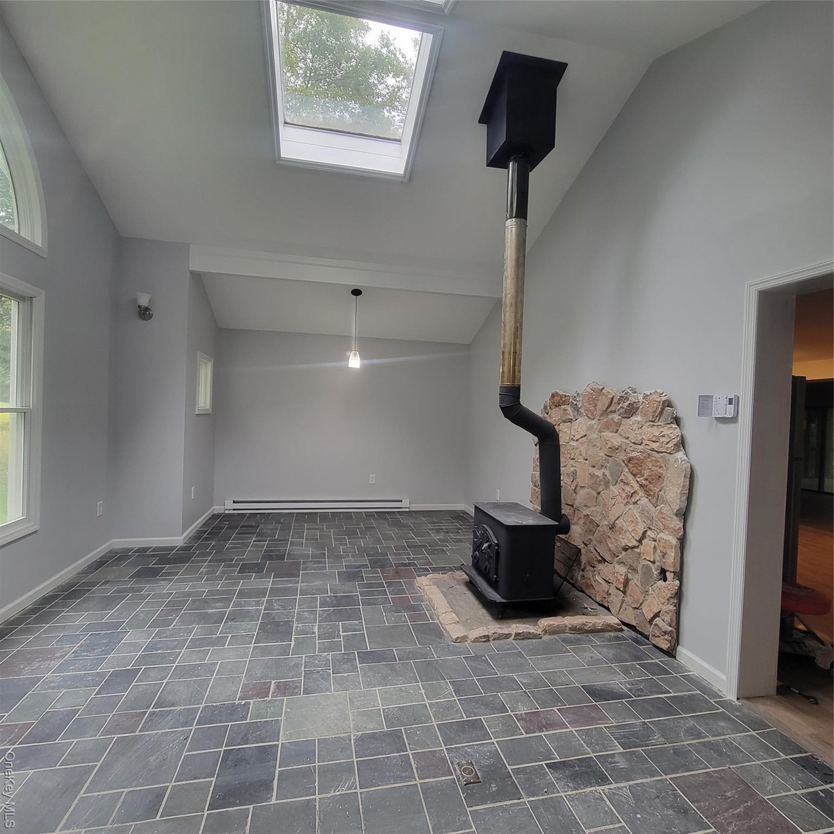 - Living Room with vaulted ceiling, skylight and wood burning stove
