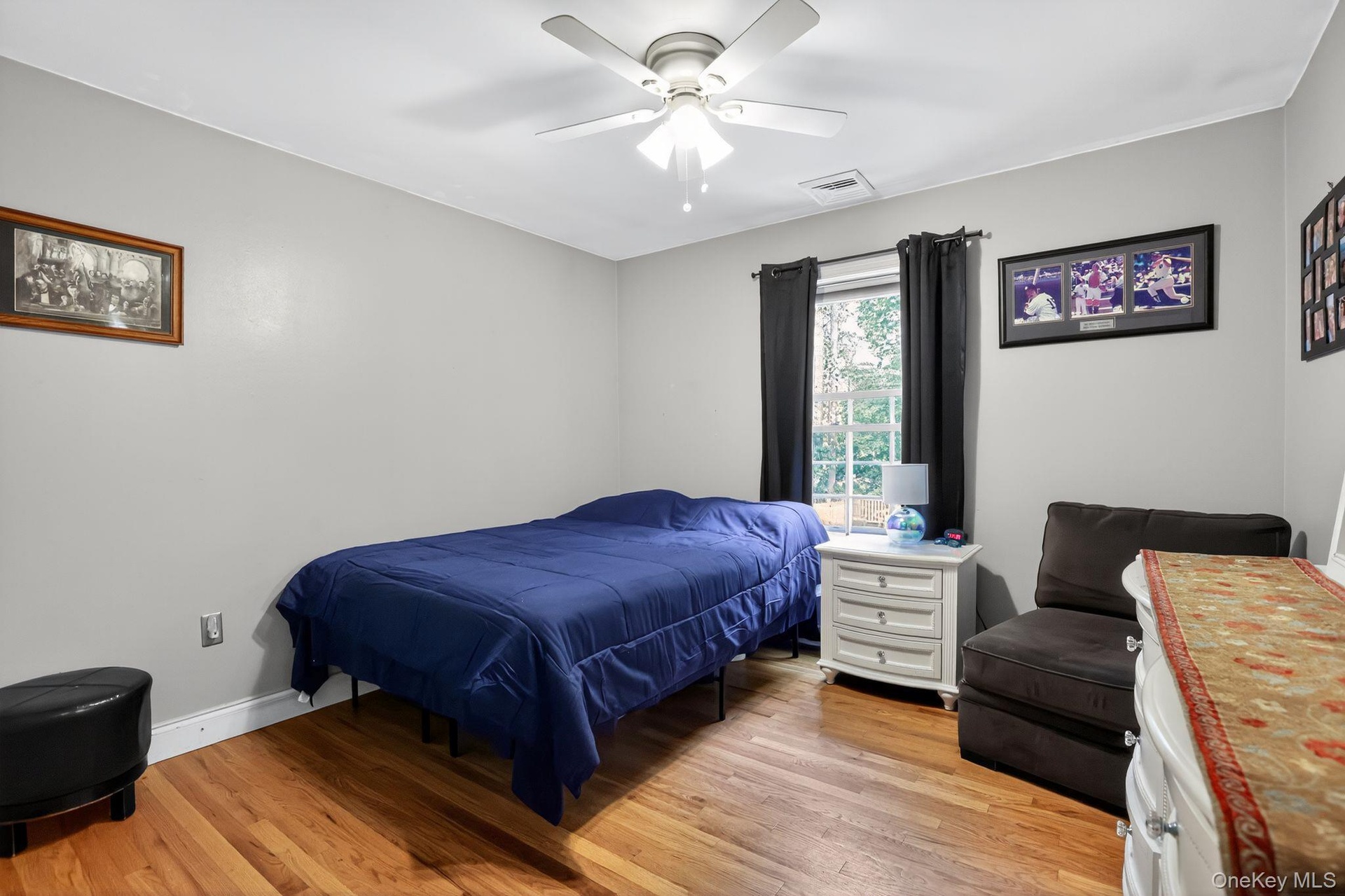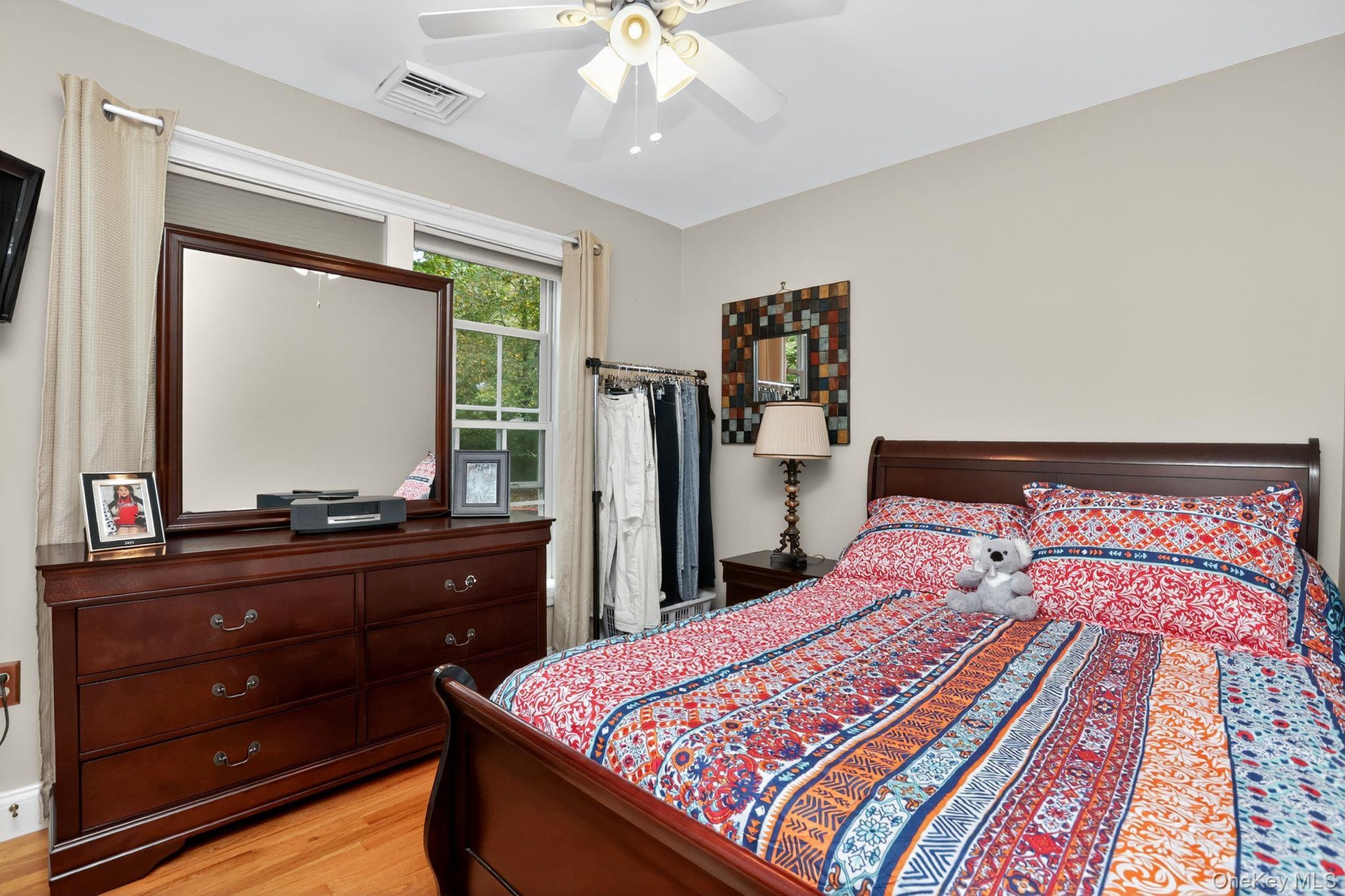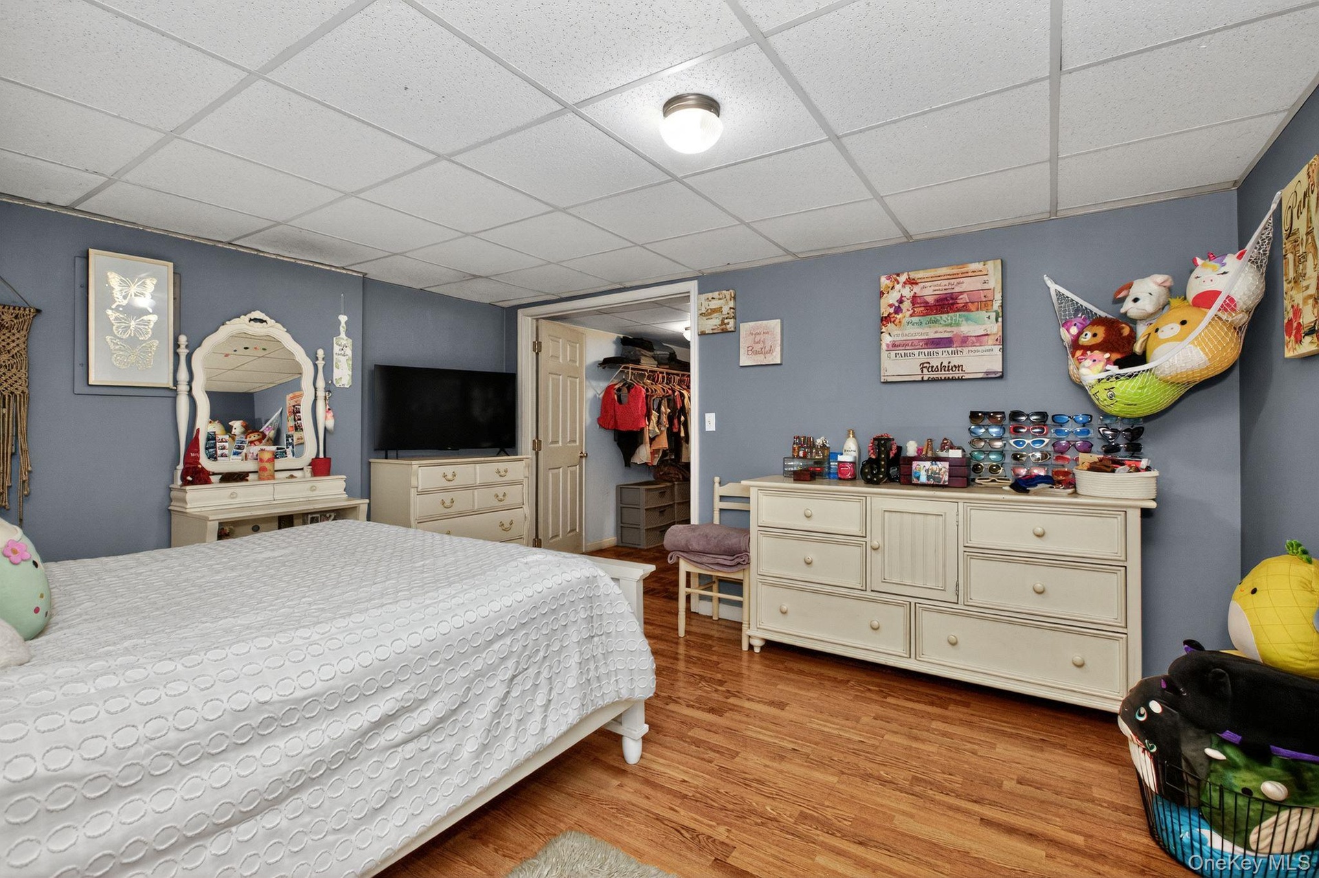 - Bedroom with light wood-style flooring, a walk in closet, and a paneled ceiling